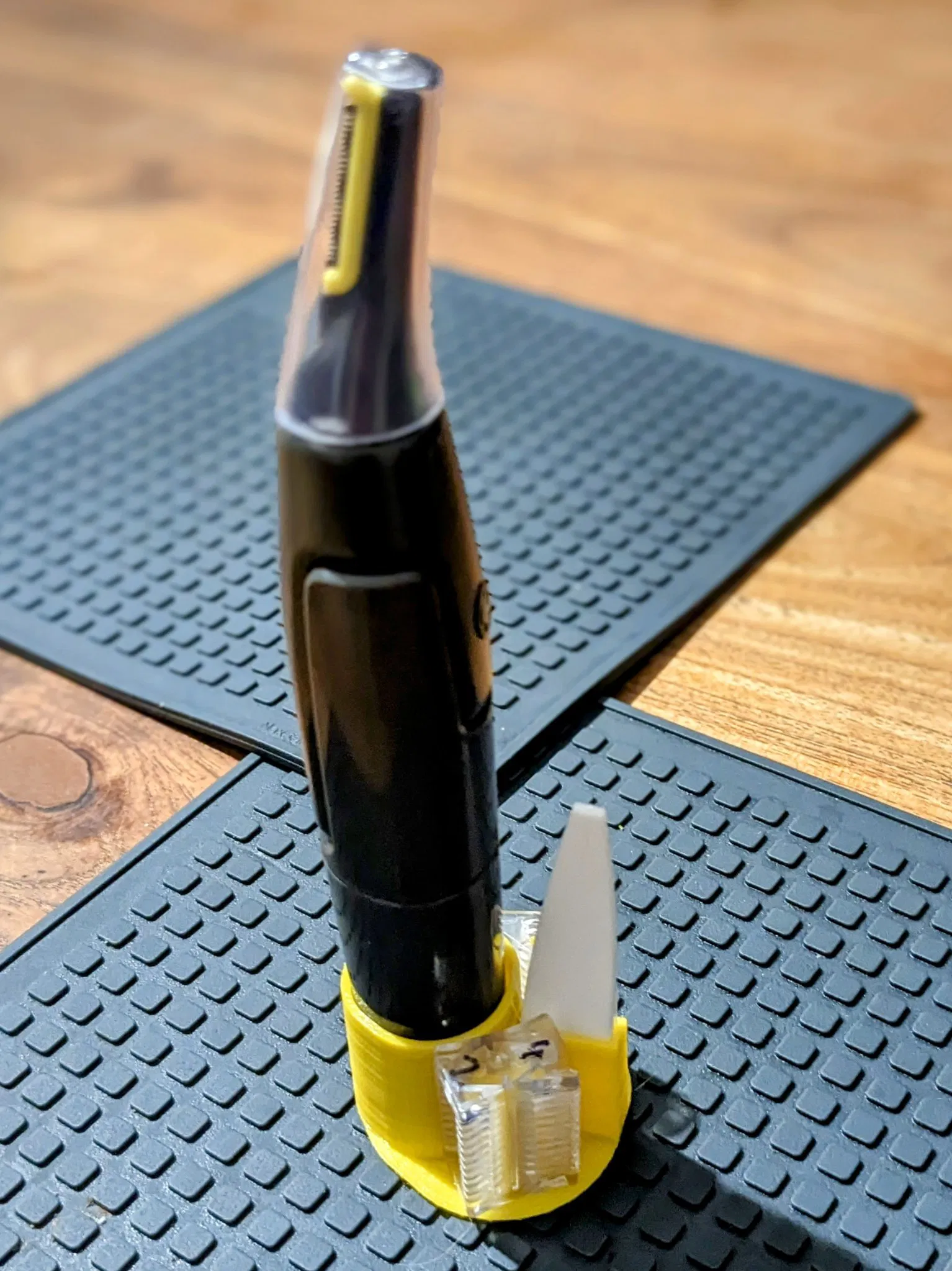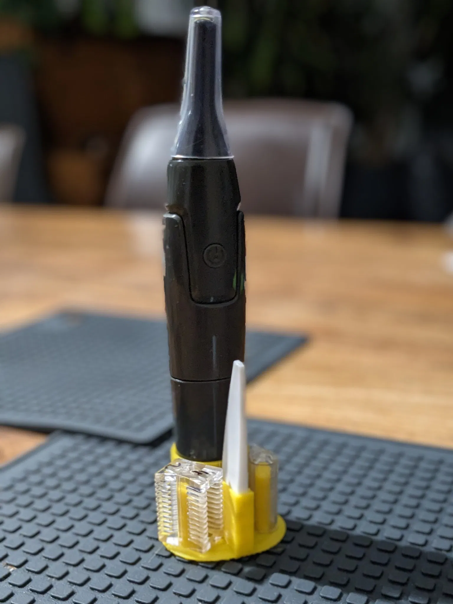 Cái đế đựng máy cắt tóc mini S-032 và phụ kiện của nó, được làm từ OpenSCAD. Thiết kế độc đáo với chân đế hình tam giác bo tròn, rất tiện lợi và dễ dàng tùy chỉnh.