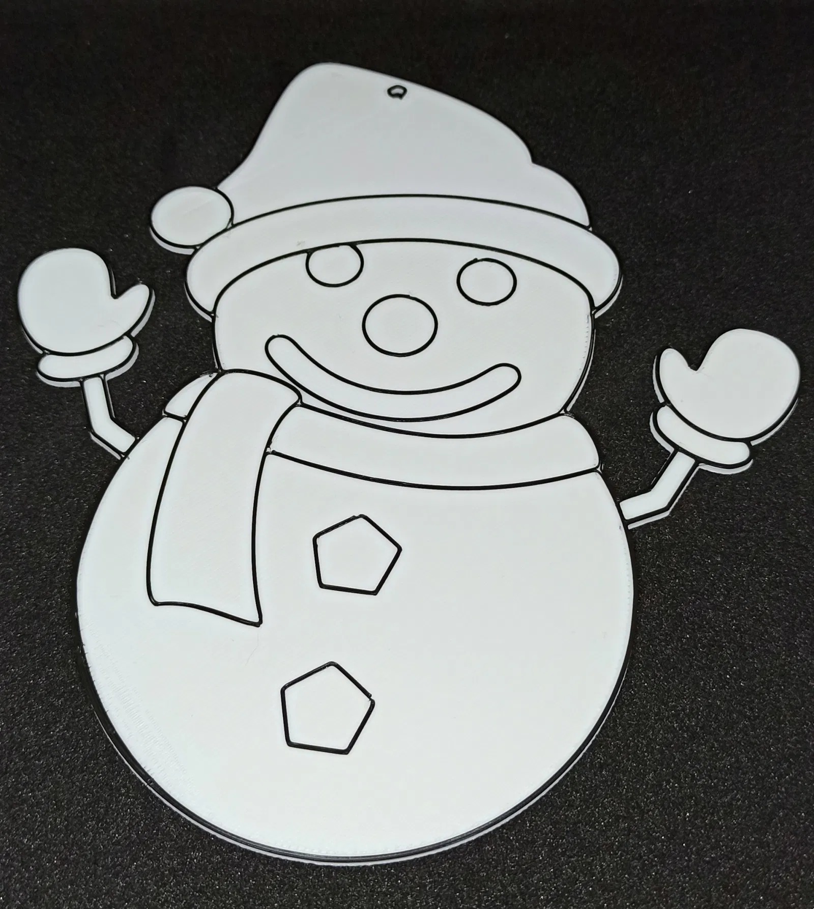 Mẫu trang trí hình người tuyết độc đáo, có sẵn lỗ để treo. Kích thước 160x150 mm, hỗ trợ thay đổi màu sắc trong quá trình in ở lớp 1.6mm (M600).