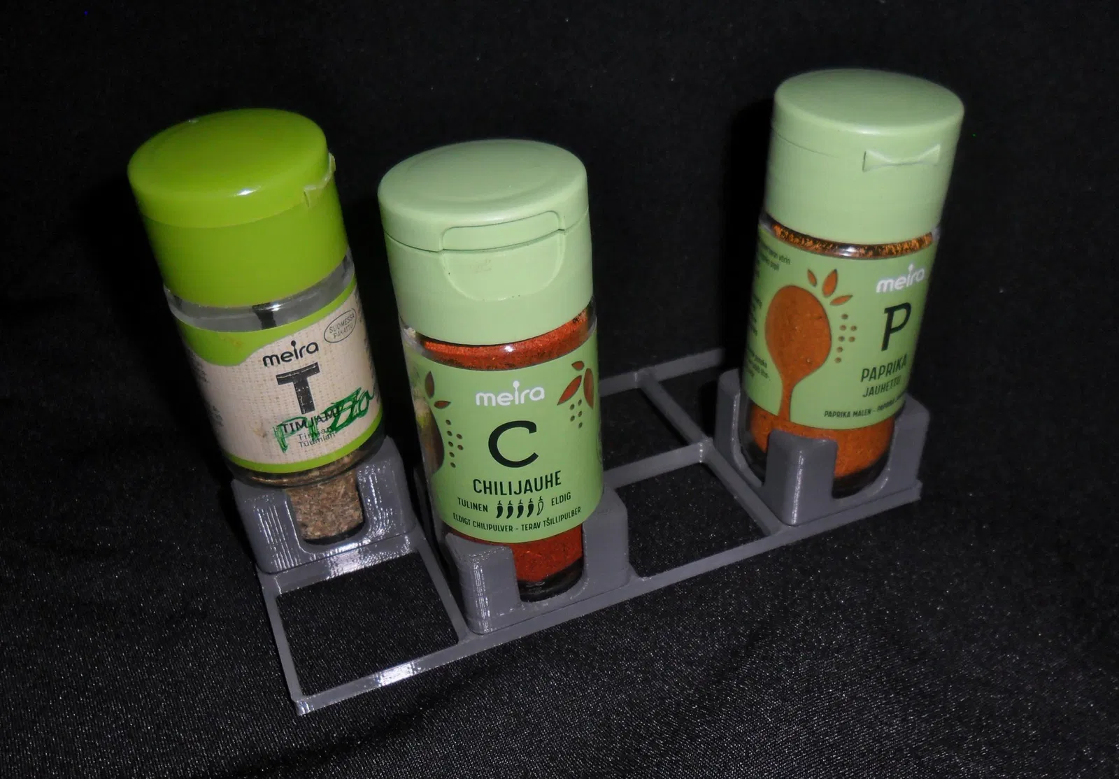 Holder đơn giản cho hũ gia vị hiệu Meira trên khung Gridfinity, không tích hợp chỗ gắn nam châm vì cá nhân mình không xài. Có thể gắn vừa các loại hũ gia vị nhỏ khác, nhưng chưa được thử nghiệm nha.