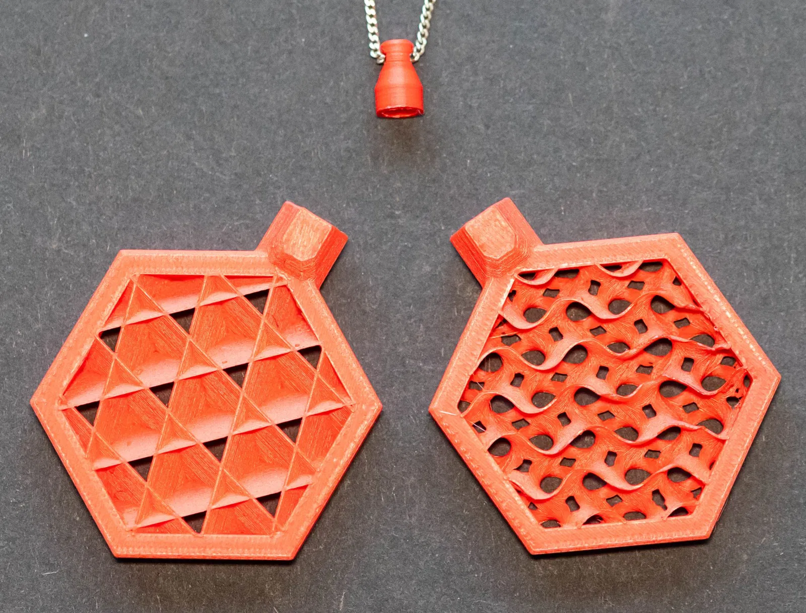 Mặt dây chuyền đầu tiên là hình lục giác, với các hoa văn "infill" đa dạng.