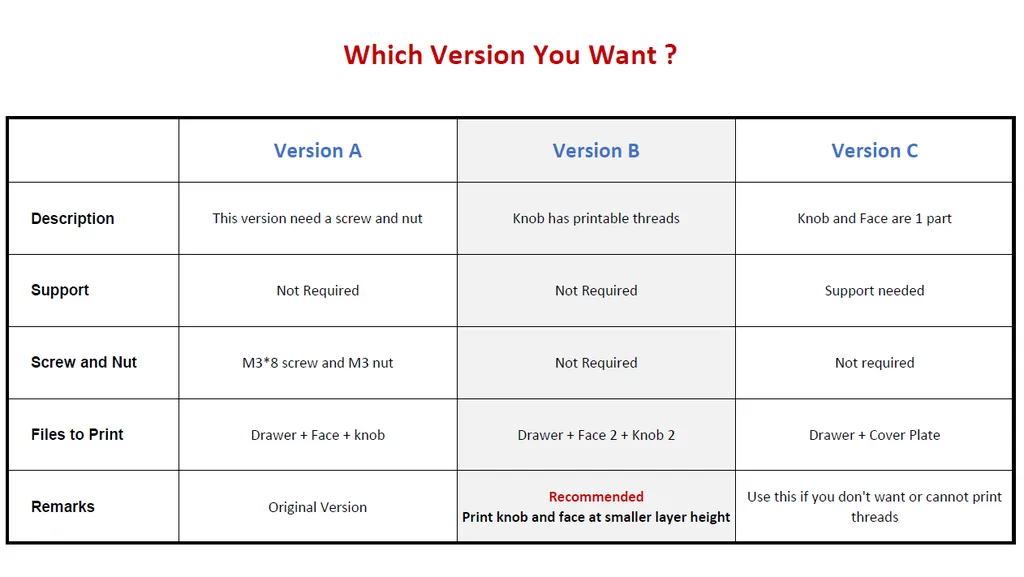 1- Phiên bản A là bản gốc và yêu cầu in 3 phần (Ngăn kéo + Mặt + Nút), ngoài ra bạn cần vít M3*8 và đai ốc M3.