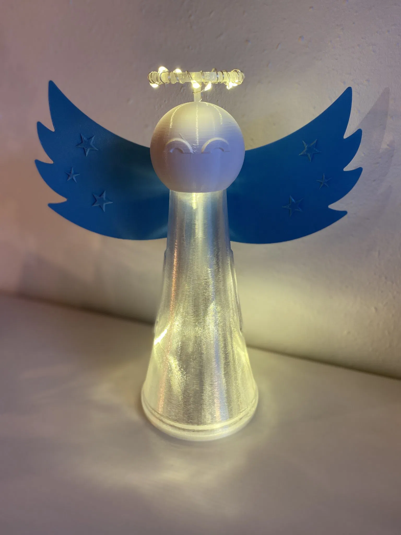 In the time when there were 100 fairy lights lying around I thought to myself....How do I get the fairy lights into the plastic? This shining angel came out. I printed all parts from PETG with a layer thickness of 0.2mm. For the base body I chose a layer thickness of 0.3mm because it shows through to me of the light I liked best. If you print the parts individually you will receive one better result. You should also definitely use a spatula for the wings they can break really easily. If the housing of the light chain is longer than the one I tested, I will include a longer bracket for printing. It would also be important to say that the switch on the light chain must be on the underside. Have fun while building!