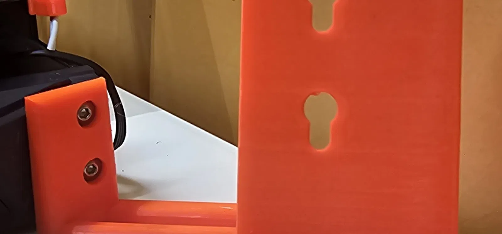 Thêm giá đỡ bằng cách gắn góc bảng điều khiển phía trước của Ender 3 S1 Plus để tránh phải cố định giá đỡ bằng ốc vít vào bàn làm việc, bàn. Đồng thời thêm rãnh để giấu cáp màn hình (không may cáp đi kèm quá ngắn nên không thể luồn qua).