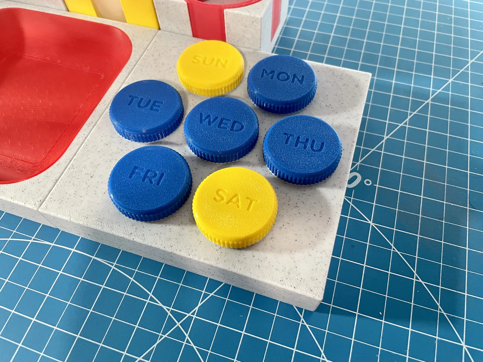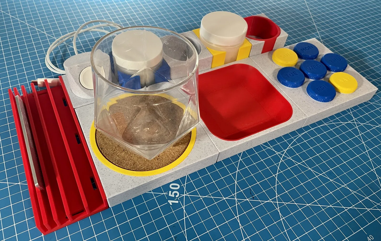 Nó được làm từ một khay Bauhaus 2x2. Nắp và ren được lấy từ "Hộp thuốc hàng tuần" của imakina nhưng được xoay để phù hợp với thiết kế này và thu nhỏ xuống 80% để phù hợp với kích thước.