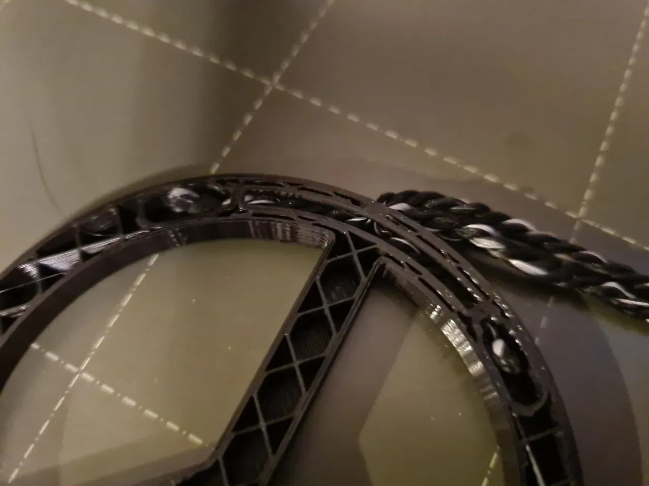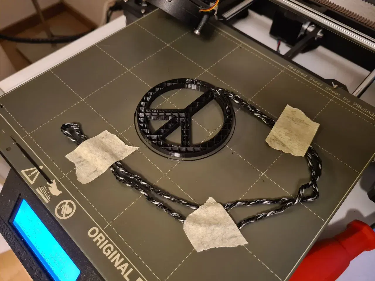 Đây là thiết kế in liền. Gcode đính kèm sẽ tạm dừng in sau khoảng 42 phút. Lệnh tạm dừng được kích hoạt sau khi in được 6mm. Điều này cho phép bạn luồn dây vào. Nhiều cầu nối đảm bảo việc luồn dây dễ dàng. Với những hình ảnh minh họa, bạn sẽ thấy một sợi dây đã được luồn vào và một thiết bị cố định tương ứng trên bàn máy in. Thiết bị này sẽ giữ chặt dây khi tiếp tục in sau khi luồn dây. Để luồn dây, nên sử dụng nhíp. Một nút thắt ở mỗi đầu dây sẽ cố định dây ở vị trí.