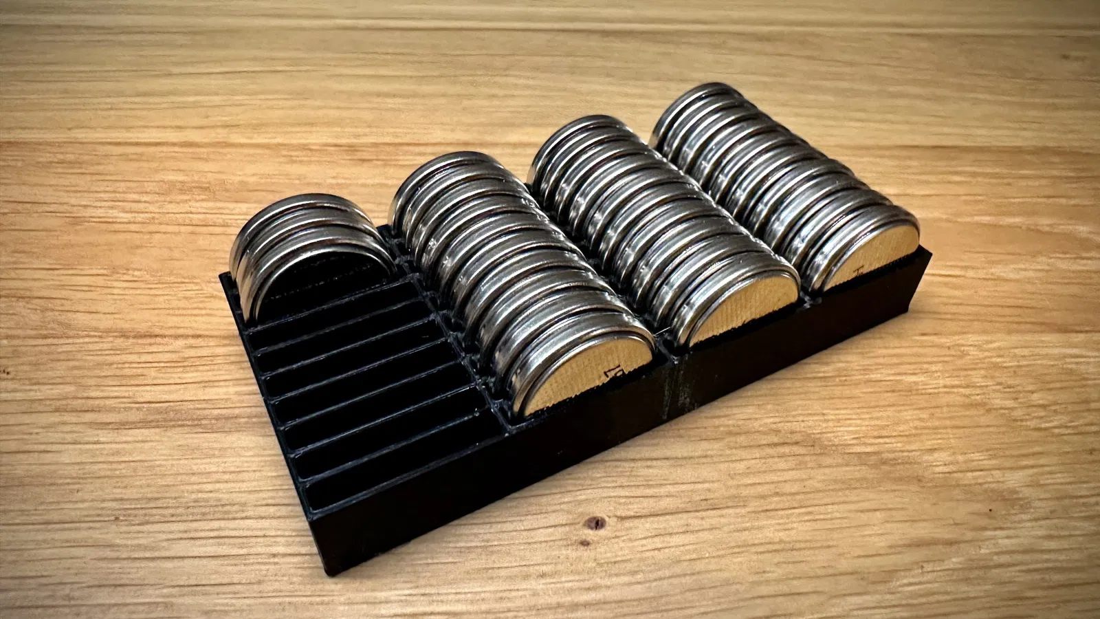 Very material-saving battery holder for CR2032 batteries in various sizes for storing 10, 20, 30 or 40 batteries.