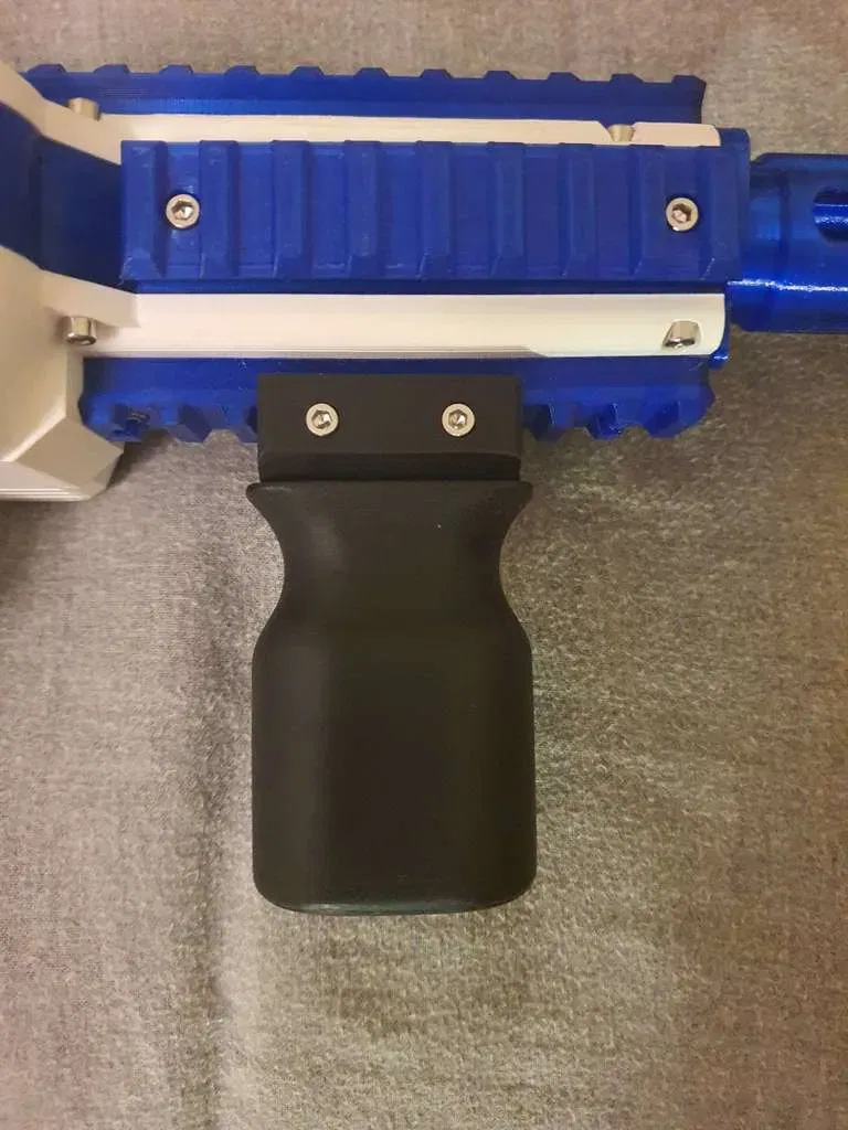Cái báng súng ngắn kiểu dọc này xài ốc M3. Thiết kế gồm 2 bộ phận riêng biệt: đế gắn ray Picatinny và báng súng. Nếu gãy đế, bạn chỉ cần in lại đế mà không cần in lại cả báng.