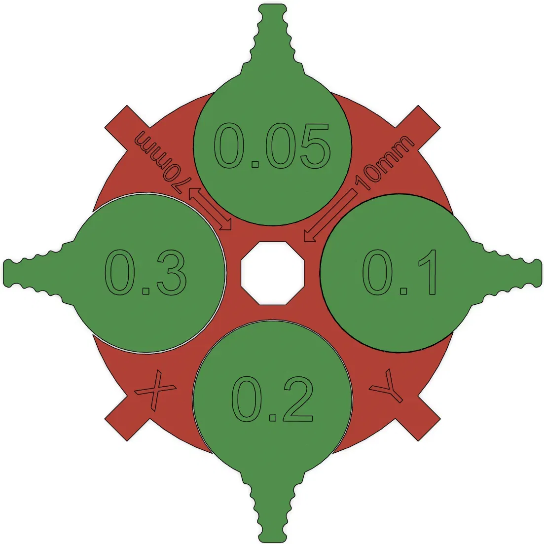 All relevant values are also printed on the model: The outer measuring points are 70mm wide, the inner measuring points 10mm and the cylinders have a gap between 0.05mm and 0.3mm The Z height is 7mm.