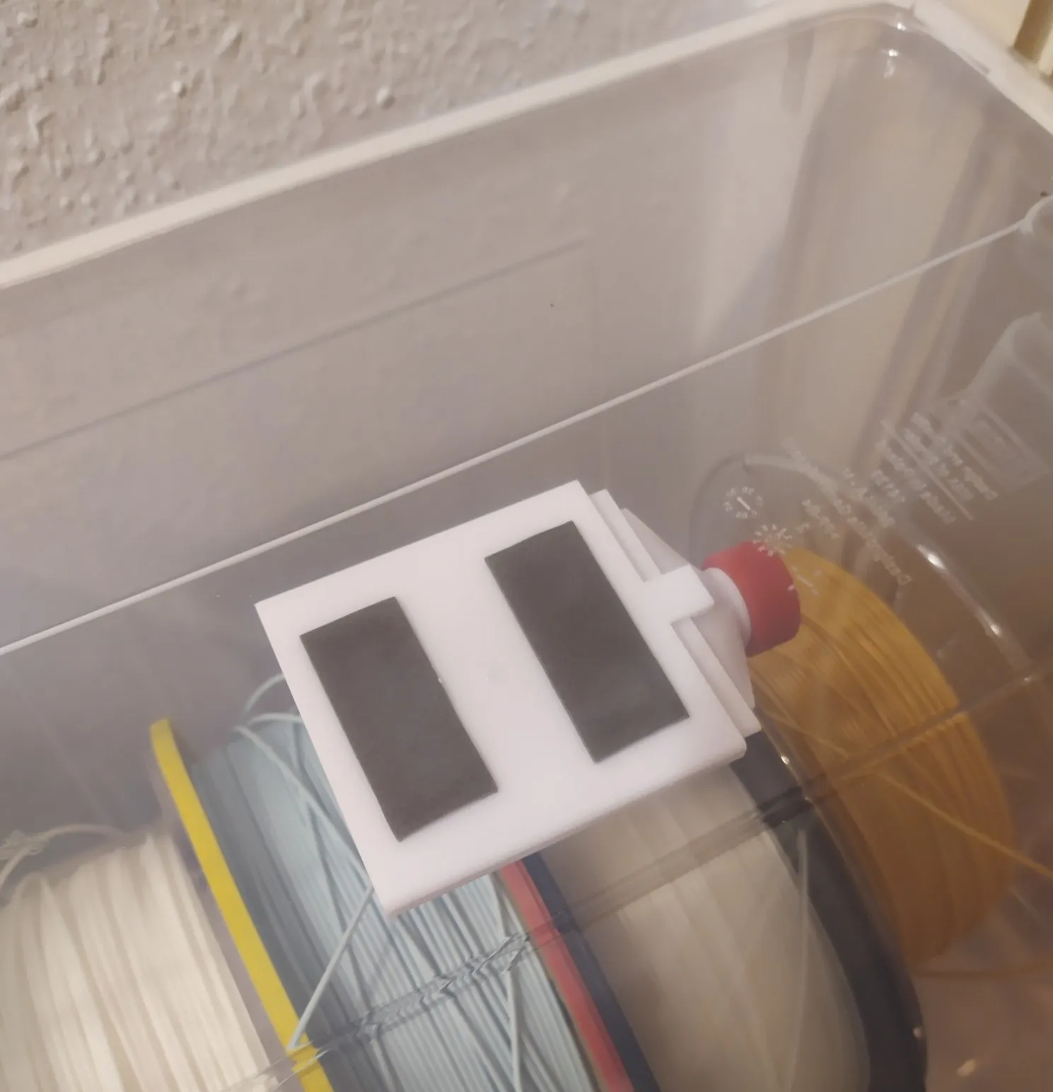 Tui làm cái hộp đựng hạt hút ẩm cỡ trung bình này cho hộp Samla Ikea nè, dán trực tiếp lên nắp bằng băng keo hai mặt. Có thêm cái phễu đi kèm luôn nha. Cỡ 50 gram, dễ dàng thay hạt hút ẩm.