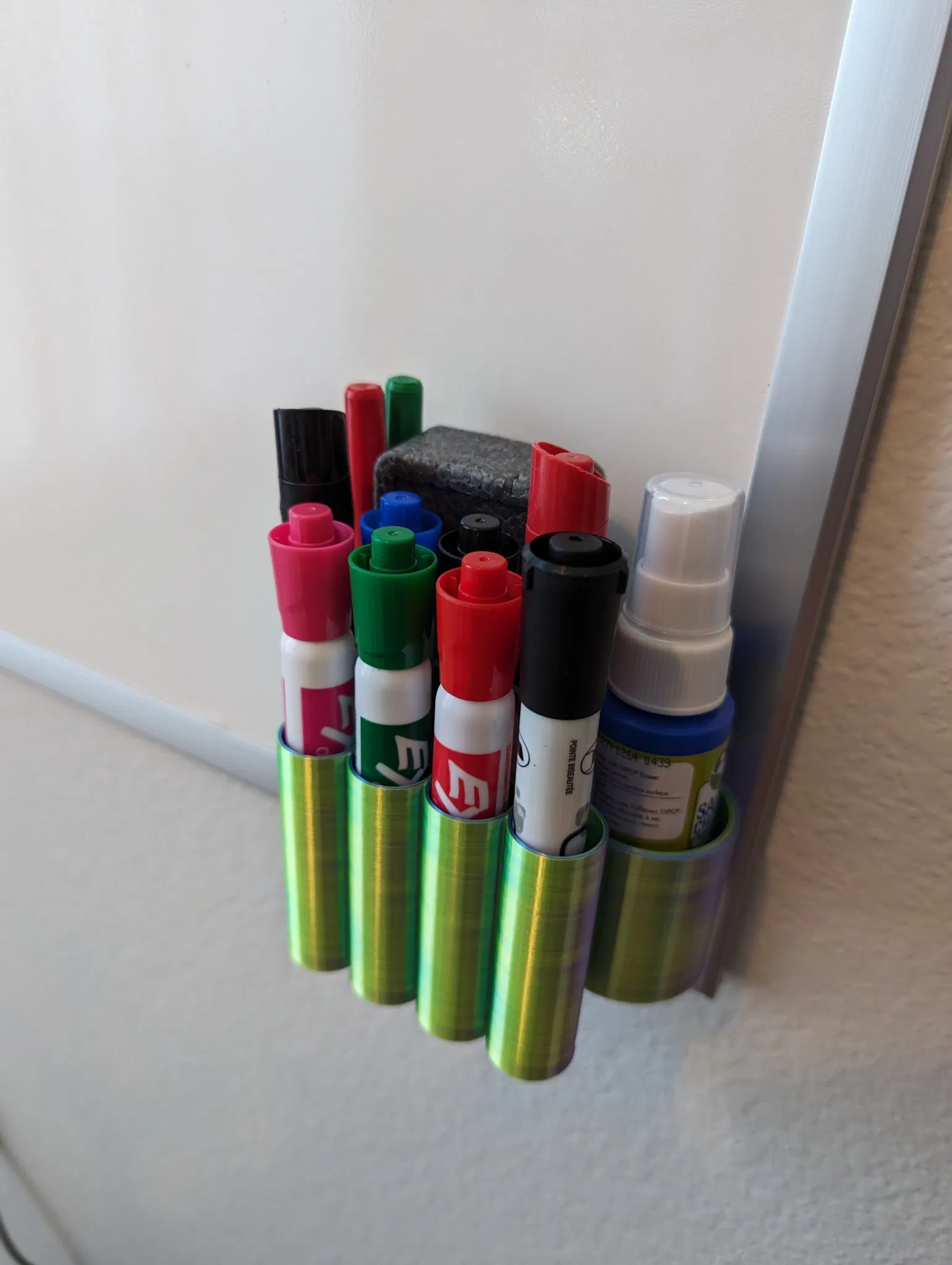 Người giữ đơn giản cho các dấu hiệu xóa khô có kích thước khác nhau. Ngoài ra, thuận tiện giữ một cục tẩy tiêu chuẩn và bình xịt nhỏ.