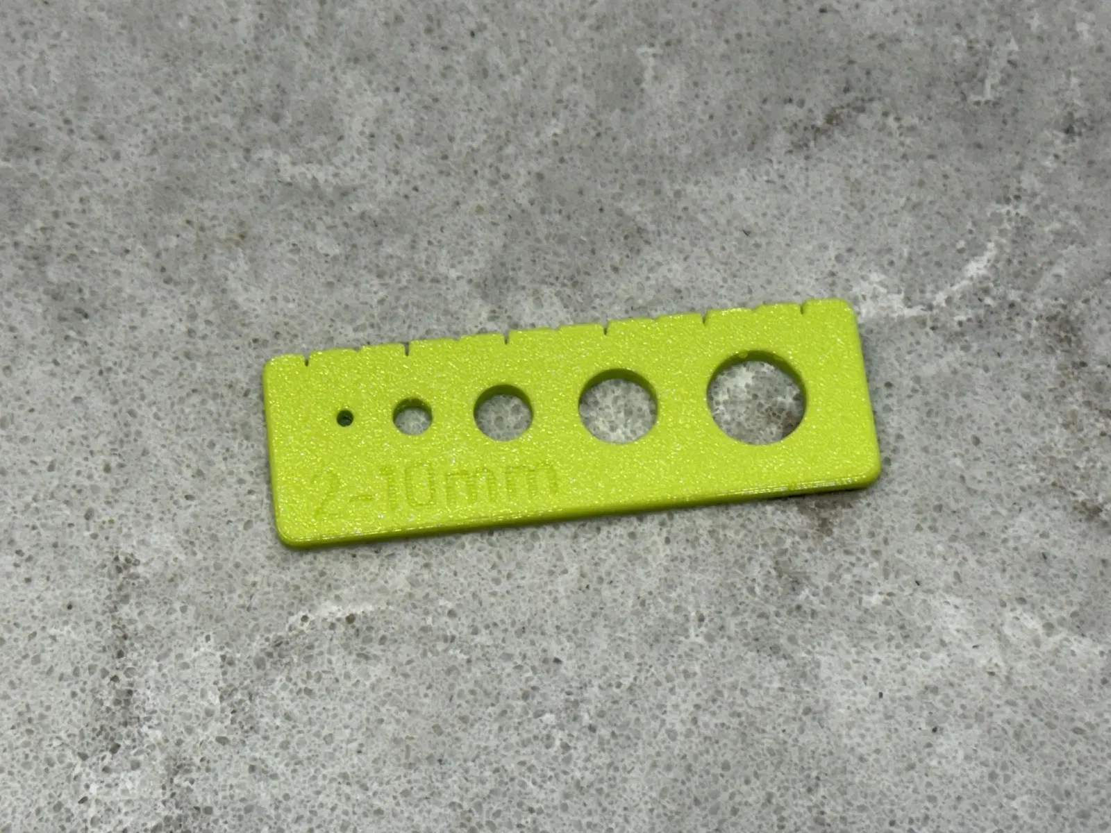 - Phiên bản hiện tại có 5 lỗ đo đường kính từ 2 mm đến 10 mm, và một thước 5 cm. Bản thân dụng cụ có kích thước 60mm x 20mm.
