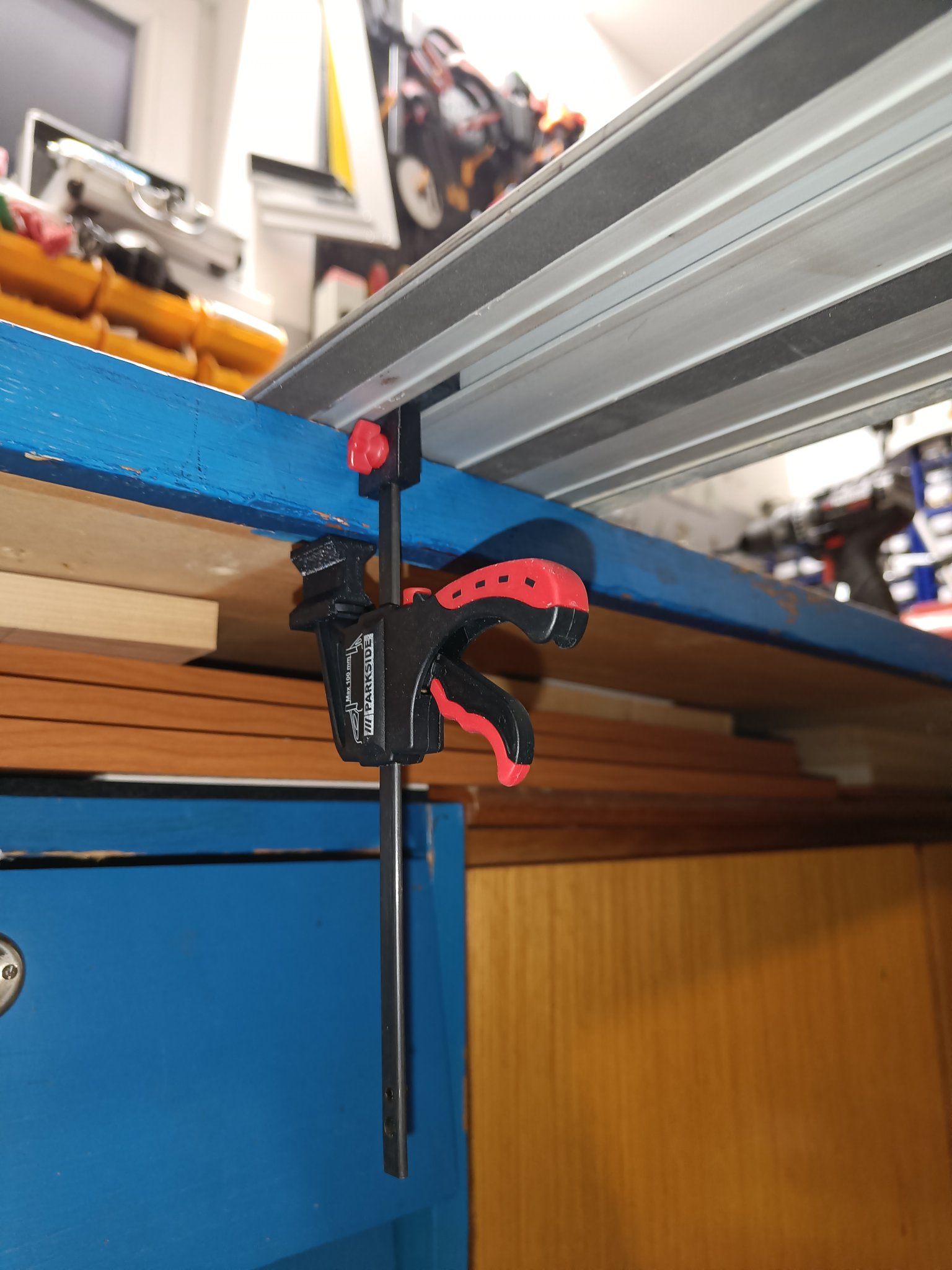 Malou upínku Powerfix z Lidlu jsem předělal na možnost upínání vodící lišty ponorné pily. Spodní čelist lze nahradit vyšším kusem, aby bylo možno upnout na tenčí stůl. Spojka lišty sice není tak pevná, jako ocelová, ale zase nestojí 500 Kč a zatím stačila.