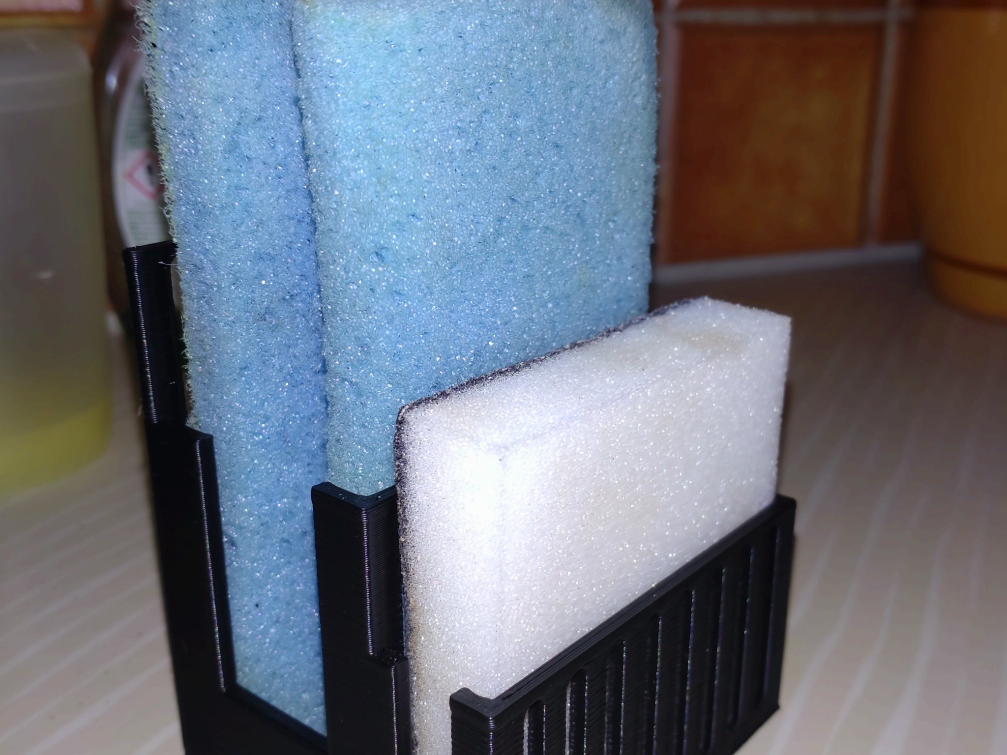 Giá đỡ này dùng để đựng hai miếng bọt biển rửa chén, với kích thước bọt biển phù hợp khoảng ~115x68x40 mm và ~68x65x17 mm. Tối ưu cho việc in bằng PLA với các cài đặt gợi ý.