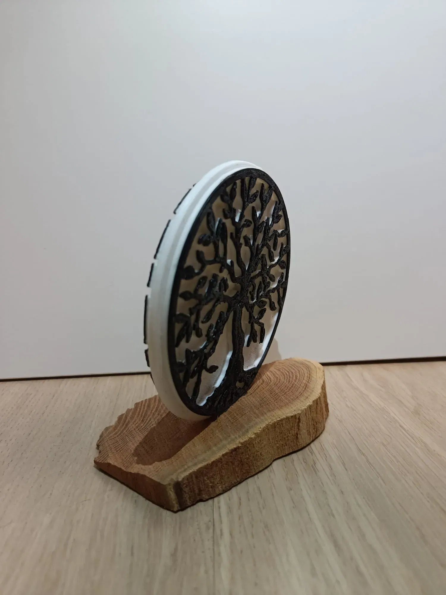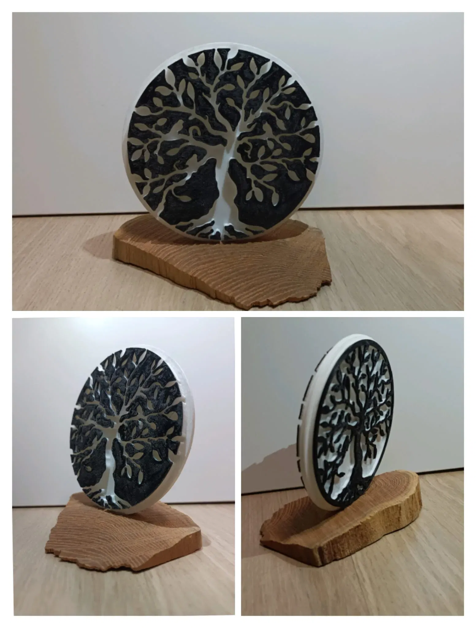 Lắp ráp hai mô hình "arbre de vie positif" và "arbre de vie négatif" bằng cách dán chúng lại với nhau. Hai mô hình này được in với một lần tạm dừng để đổi màu. Còn phần đế, tui dùng một khúc gỗ tìm thấy trong rừng. Tui khoan lỗ 3.5 mm và dán mô hình in vào đó.