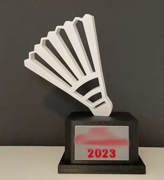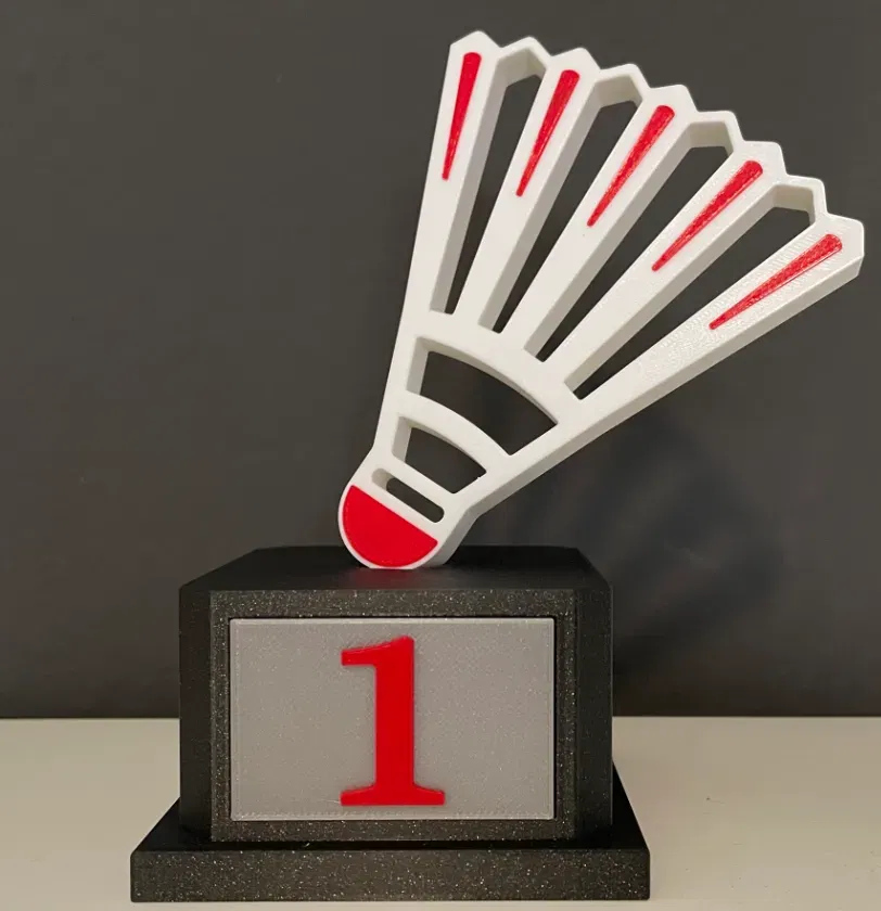 Một chiếc cúp đa màu sắc cho các giải đấu cầu lông. Bao gồm các bộ phận có thể in riêng lẻ và lắp ráp lại với nhau. Hướng dẫn chi tiết về cài đặt in cho từng bộ phận bằng PLA, với gợi ý sử dụng Prusa Slicer để thay đổi màu sắc mà không cần MMU3.