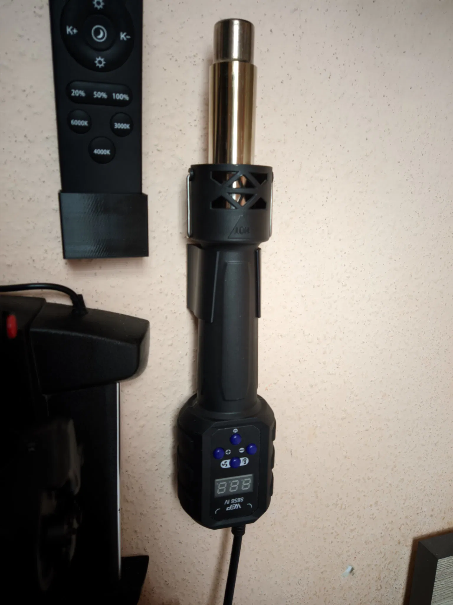 Giá treo tường cho WEP 8858 HOTAIR. In có support, khuyến khích dùng PET-G hoặc ABS. Gắn bằng băng keo hai mặt hoặc vít. Bản V2 có cải tiến về khe hở và kẹp nozzle.