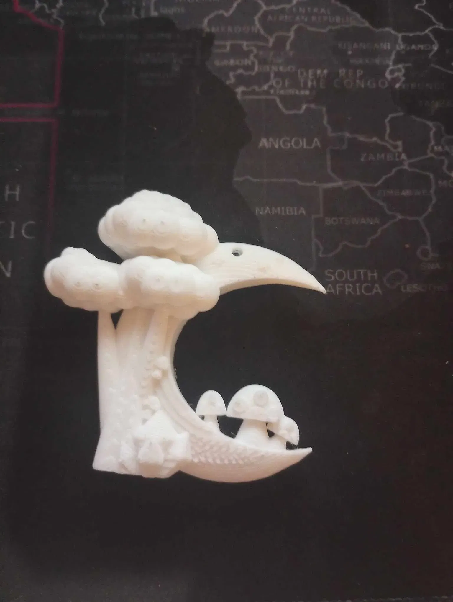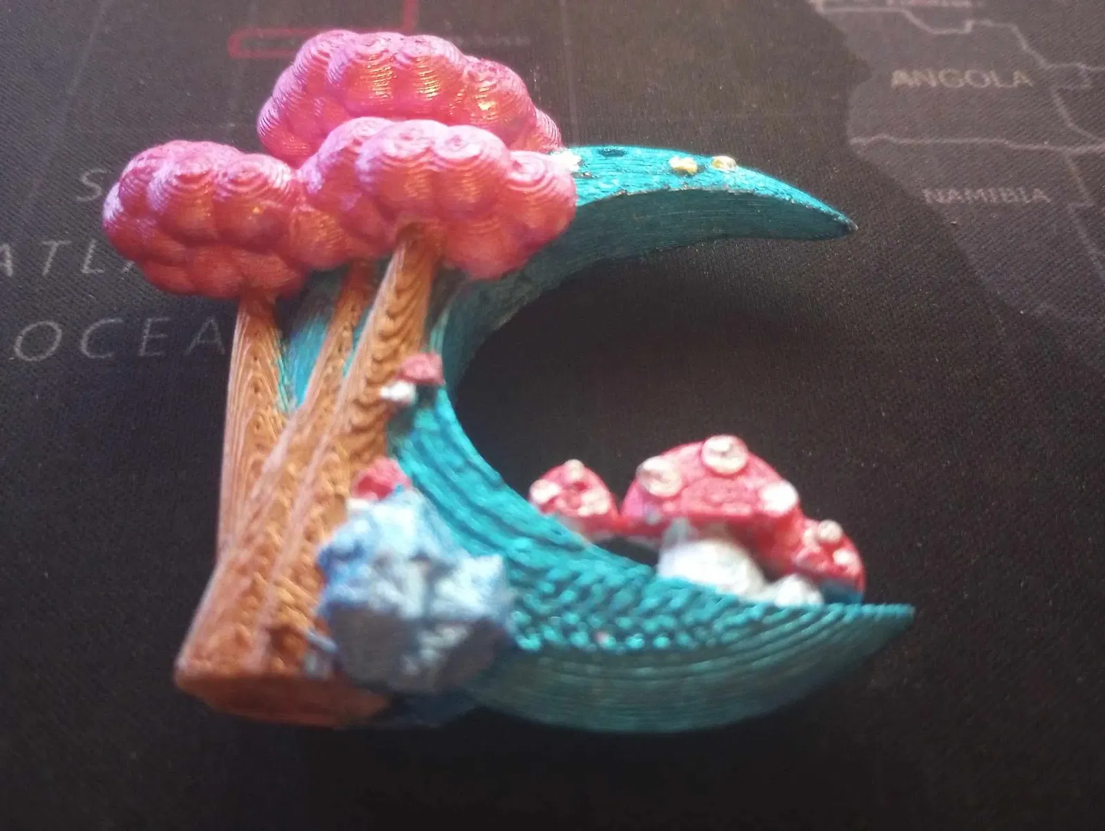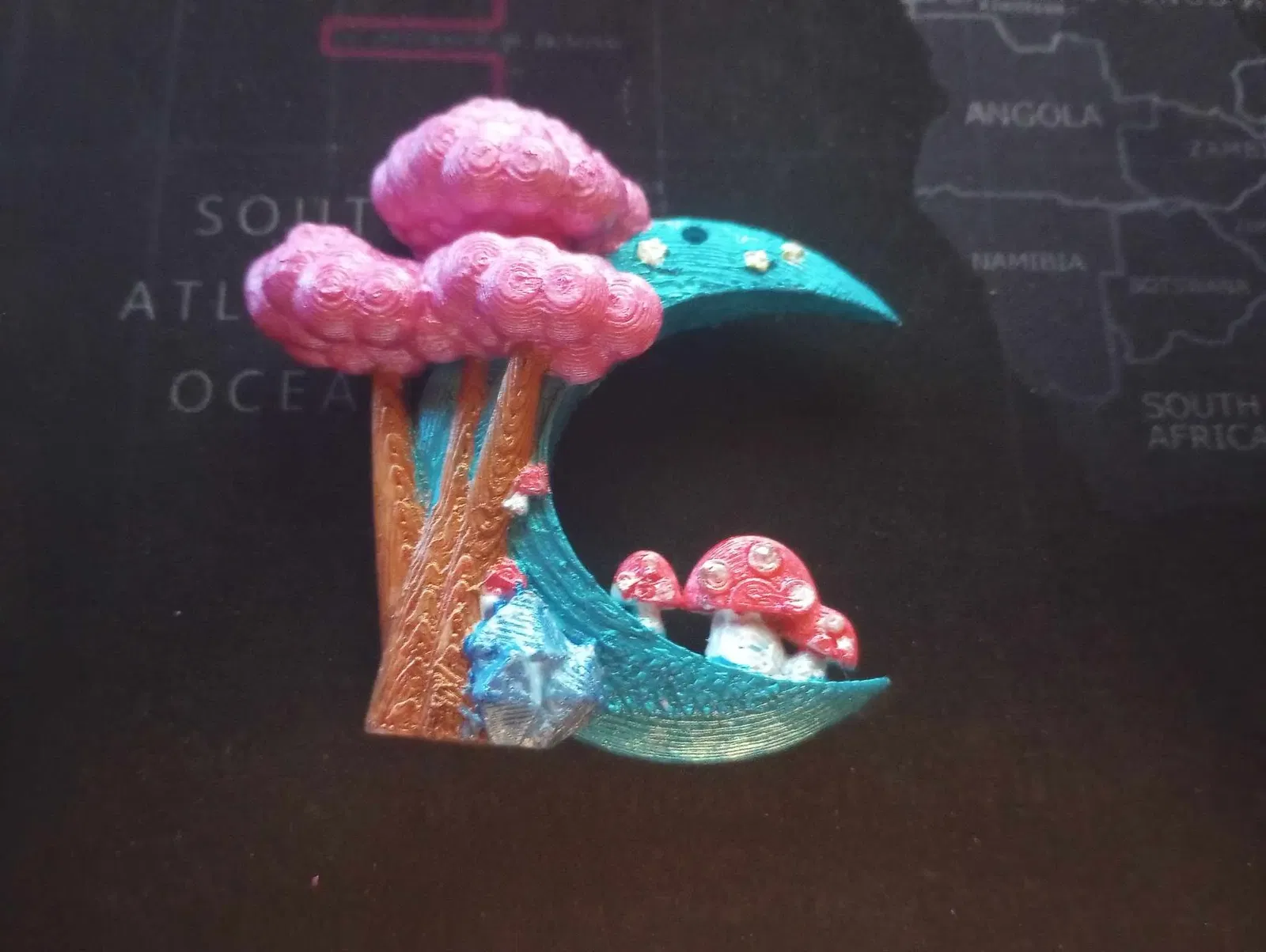 Tui làm cái này trong Tinkercad để tham gia cuộc thi trên Printables. Ảnh chụp ở chế độ nháp, hiện tại đang in chế độ tinh xảo để có thêm chi tiết. Tui có dùng supports với mật độ 10% để hỗ trợ in. Tui đang làm thêm các mẫu khác của cảnh này để làm vật trưng bày lớn hơn.