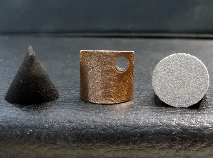 Trong ảnh được in bằng Đồng thau, Thép không gỉ pha Đồng, SLS Nylon Đen, SLS Alumide và PLA Đồng kim loại FDM Filaprint.