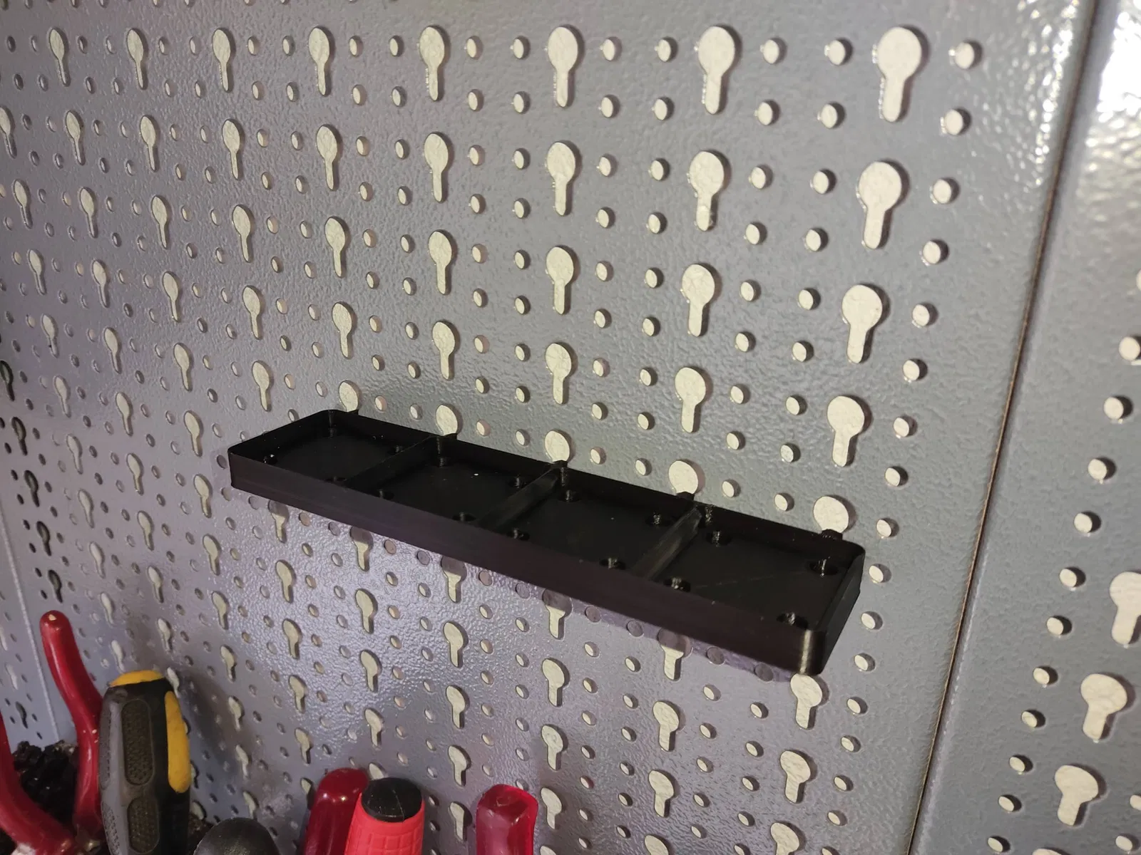 Một khay đế Gridfinity rộng 4, sâu 1, có thể lắp vào bảng Küpper. Thích hợp để tổ chức không gian làm việc hoặc lưu trữ các bộ phận nhỏ.