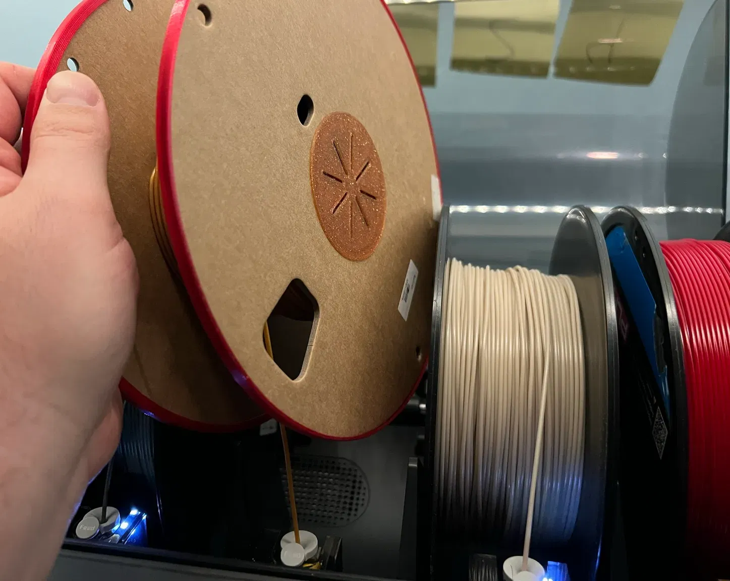 Light weight spools sometimes bind in AMS. Add weight to spool with dessiccant, solve weight problem & keep AMS dry as bonus. These have been optimized for minimal plastic use and produce a very snug fit. Maybe too snug, some light sanding with 220G will improve the fit dramatically. PLA Settings: Defaults - 4mm nozzle/0.20 mm NORMAL Pairs well with .