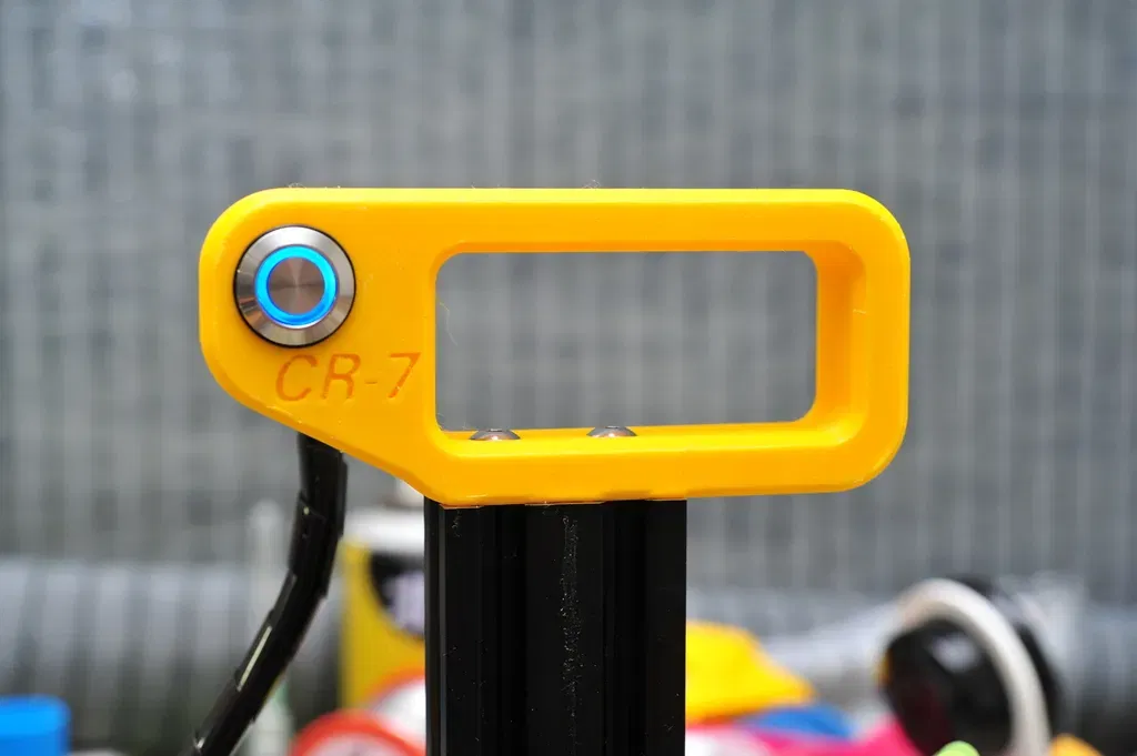 Thay thế tay cầm zin của CR-7 bằng tay cầm mới có tích hợp nút nguồn. Nút nguồn có đường kính 16mm. Lưu ý cần sử dụng relay để đóng ngắt nguồn cho máy in 3D do công tắc có thể không chịu được dòng điện cao.
