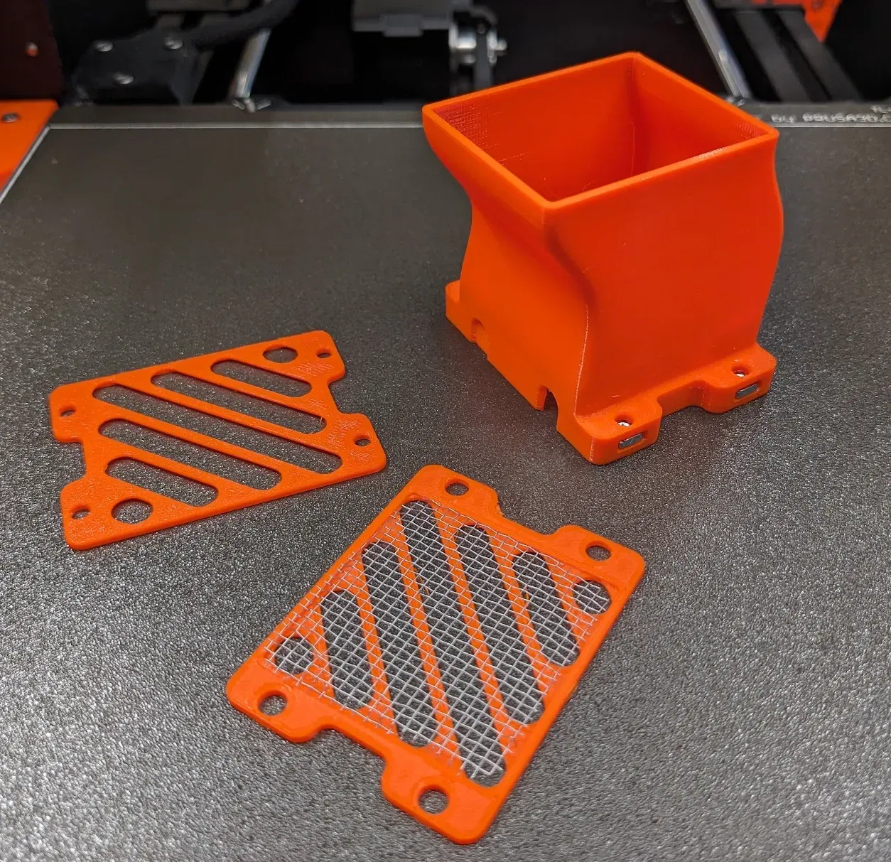 Tui đã thiết kế lại ống làm mát Einsy cho cao hơn 55mm để vừa với hộp Big Einsy Case, có chỉnh luồng khí, chỗ gắn quạt sâu hơn và thêm lưới bảo vệ. Có 4 tùy chọn lưới chụp và có thể cần ốc dài hơn nếu gắn lưới.