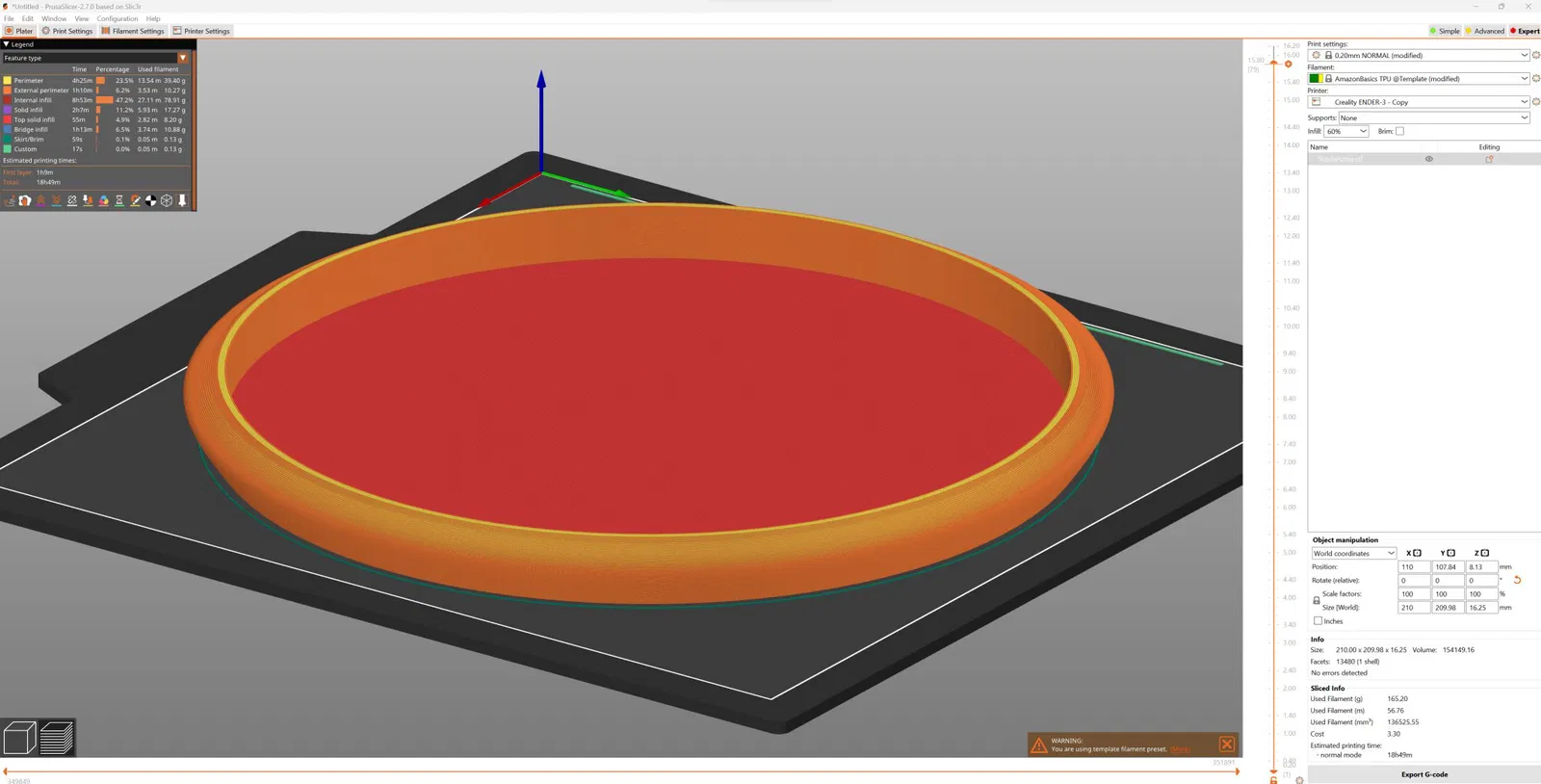 Để xem ảnh chụp màn hình từ PrusaSlicer với sợi TPU Amazon Basics có mật độ khác với loại tôi đã sử dụng. Hãy hiệu chỉnh cho sợi nhựa của bạn trước, sau đó điều chỉnh lưới lót theo trọng lượng mong muốn. Đối với trọng lượng đó, các cài đặt gần đúng là: