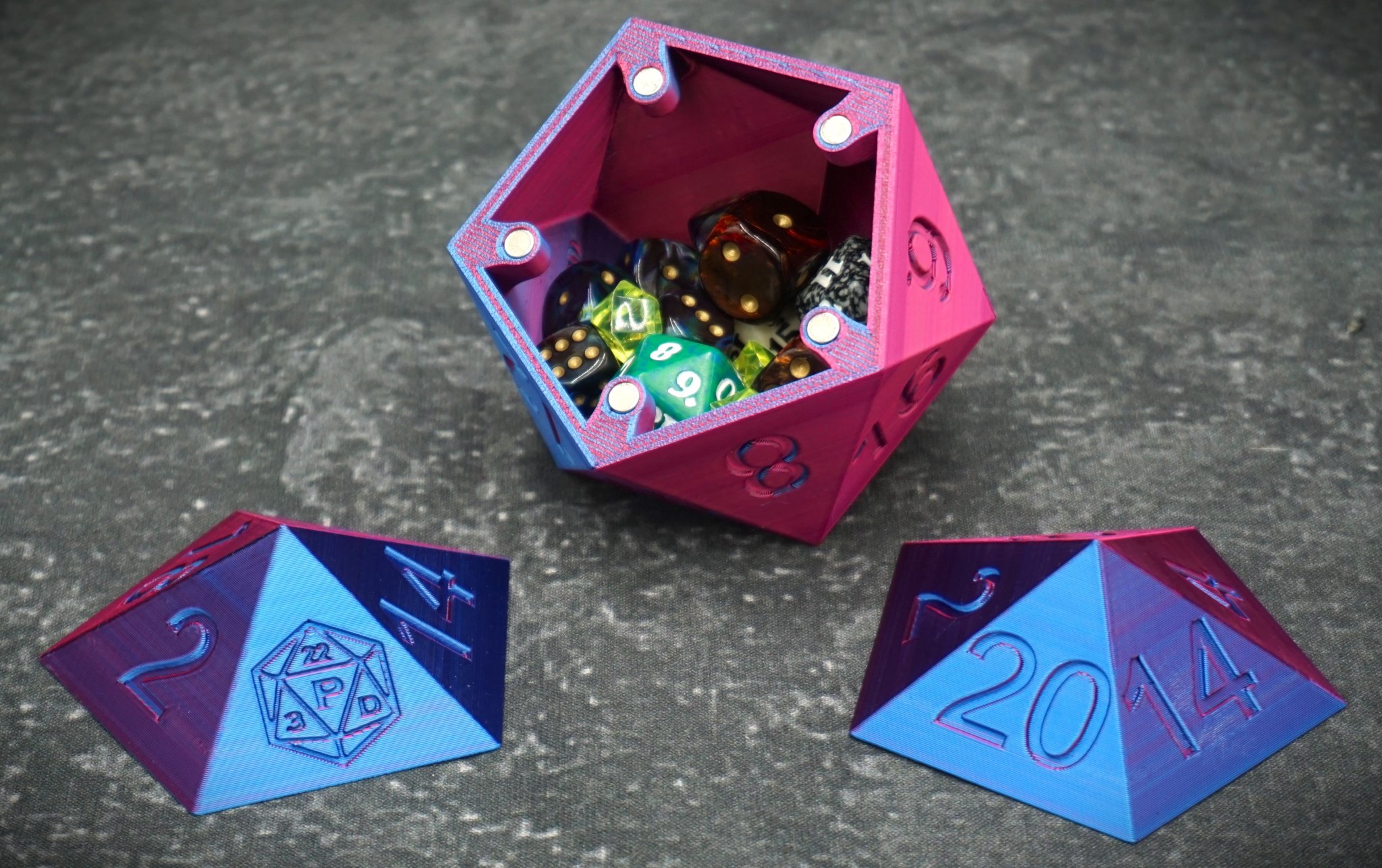 Here you get a D20 Dice Box that has been designed so that you can insert round 5x5mm magnets. This gives a secure hold of the lid for transport and looks super sexy.