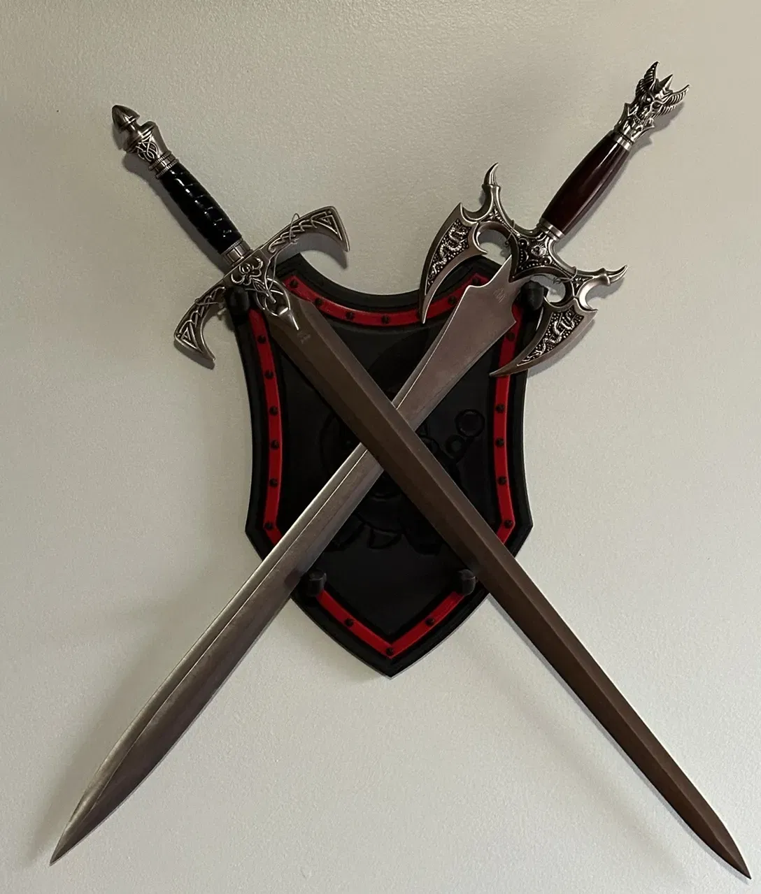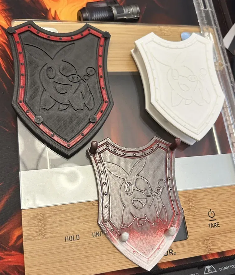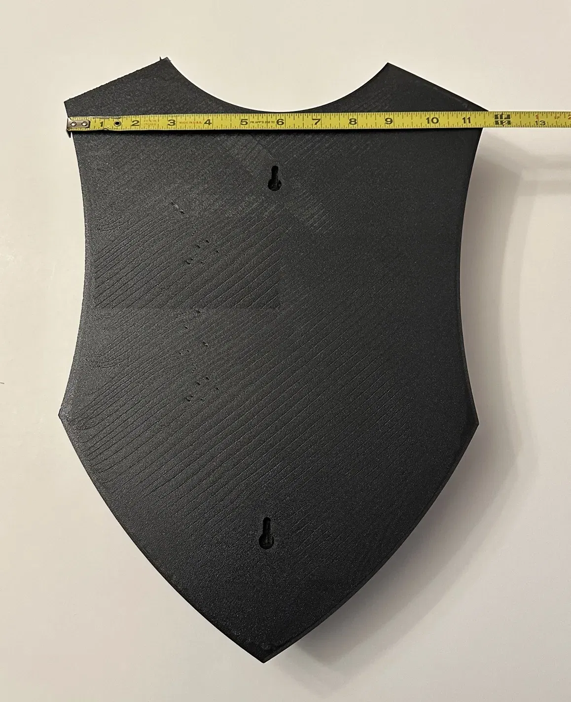 Shield_Bottom & Shield_Top - I did not print a full-size version of this as we went with the “Single” model for our son, however there is a 35% version shown in the one sample pic. These both can also be printed with 5 perimeter walls, 10% gyroid, no supports needed. This one needs glueing together, and you would need to slide the swords down inside after mounting to the wall. Probably not suitable for coats :)