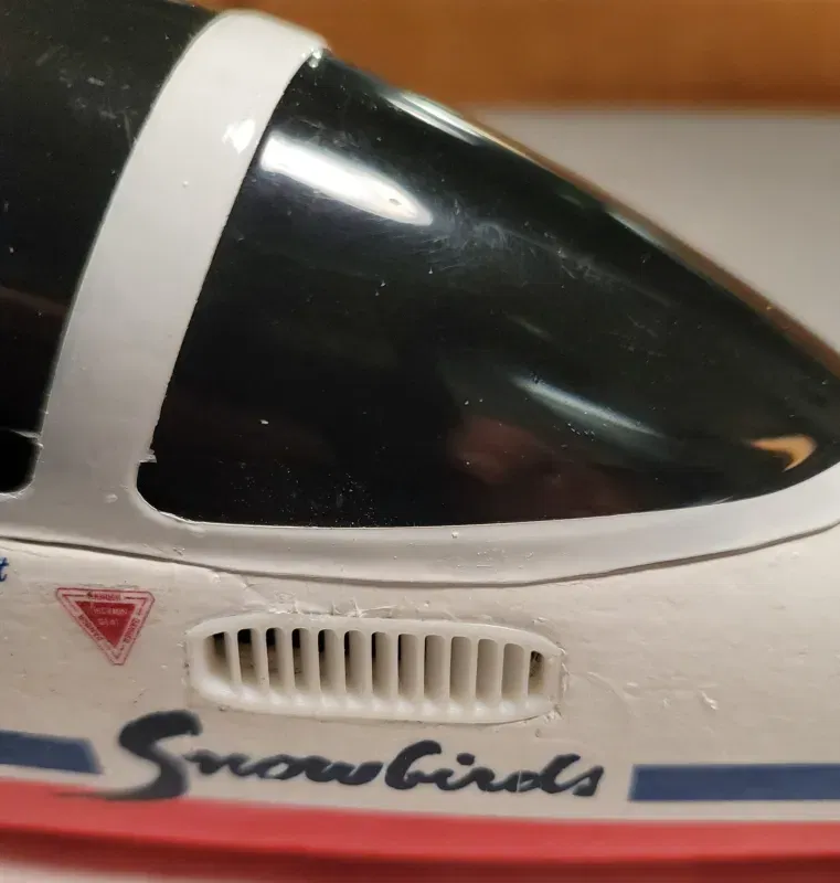 Cùng với khe gió, tui còn làm một cái khuôn mẫu để đảm bảo lắp đặt vừa vặn hoàn hảo. Chỉ cần giữ khuôn mẫu ngay chỗ bạn muốn đặt khe gió, dùng bút chì tô theo đường viền rồi dùng dao rọc giấy Xacto cắt ra. Sau khi xong, nhỏ vài giọt Foam-Tac hoặc bất kỳ loại keo nào bạn dùng và thế là xong. Tui gắn một cái ở mỗi bên của chiếc máy bay mô hình của mình.