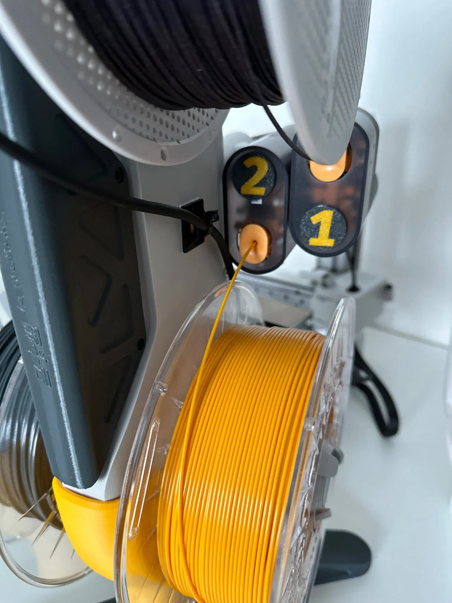 Cần mẹt số khi dùng AMS với Chân đế AMS Lite để xoay AMS lại, giúp nạp dây tóc dễ hơn. Những con số này giúp bạn biết lối nào đúng (1, 2, 3, 4) mà không cần nhìn phía sau. Mẫu này in hai màu và số hướng xuống khay in.