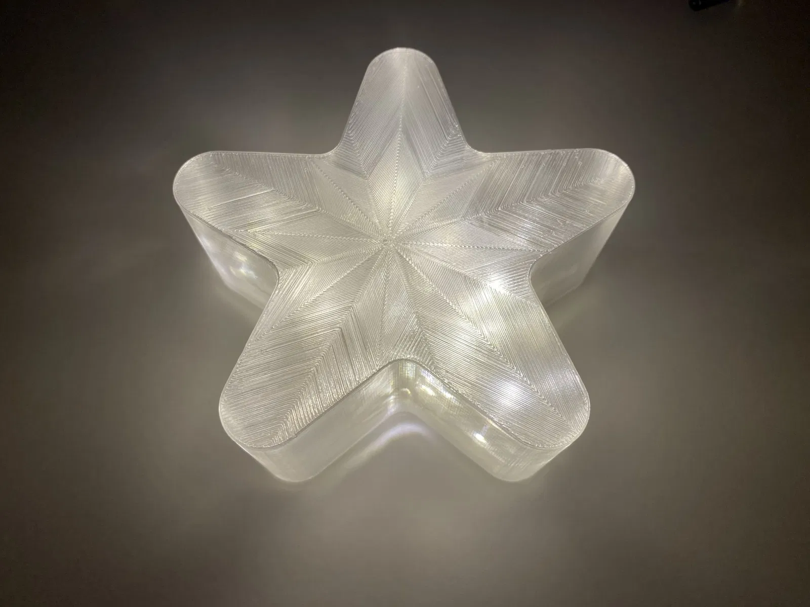 Phần chính, tức là ngôi sao, sẽ được in bằng chế độ "vase mode" với độ dày lớp là 0.3mm và chỉ có lớp đáy và lớp trên cùng. Bạn sẽ dùng họa tiết "eight-star spiral" để tạo hiệu ứng đóng băng nhé. Các bộ phận khác mình in với độ dày lớp là 0.2mm và bạn sẽ cần "support material" cho hộp pin và nắp.