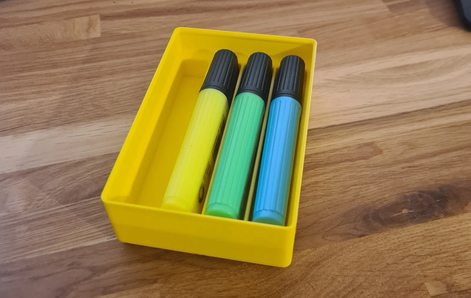 Cái này là cái hộp Gridfinity để đựng được tới 4 cây bút dạ, thiết kế có thể xếp chồng lên nhau đó. Dùng hay lắm nha!