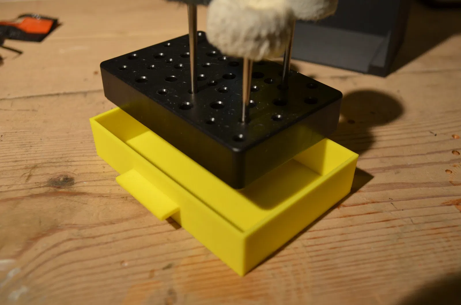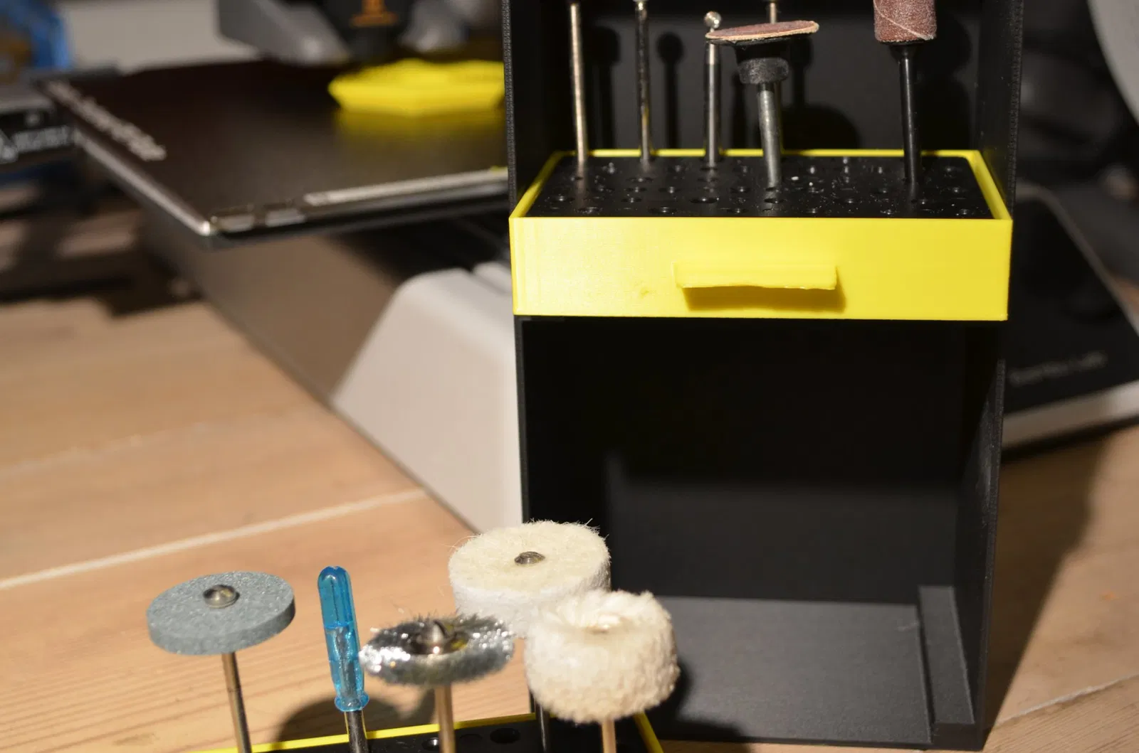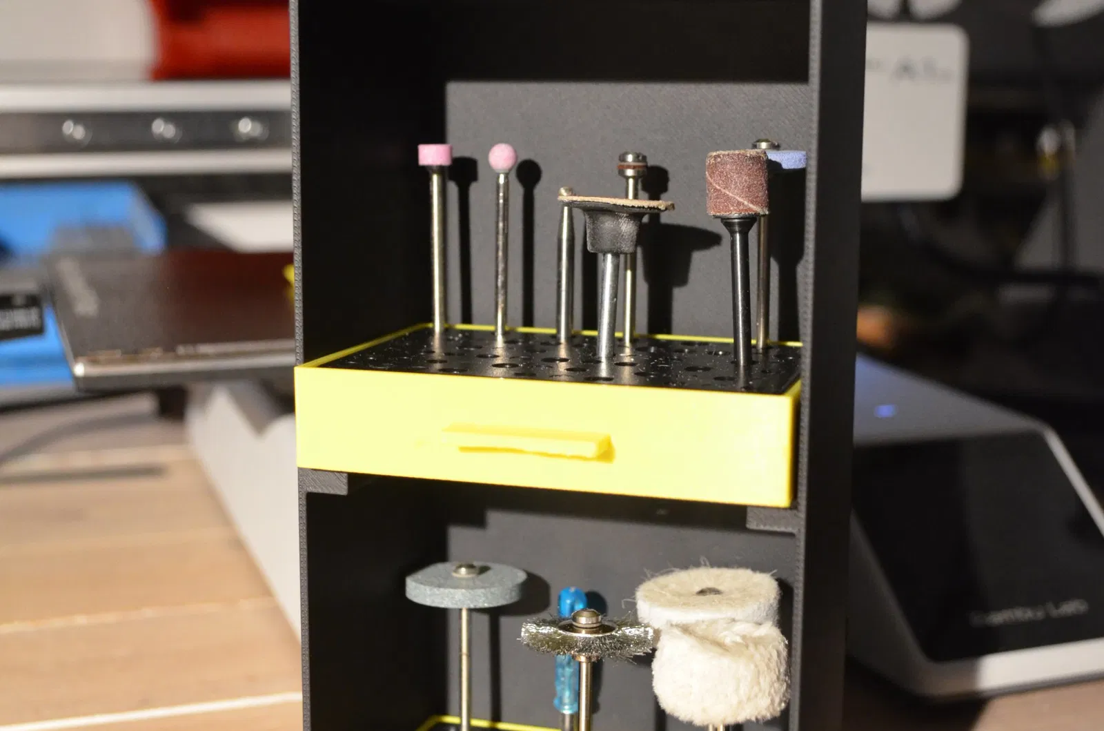 Tôi đã tạo ra một cái tủ nhỏ để đựng các đầu máy đa năng của mình. Món đồ này được in trên máy Bambulab A1 mini, phần ngăn kéo có sử dụng support khi in, còn phần tủ thì không cần.