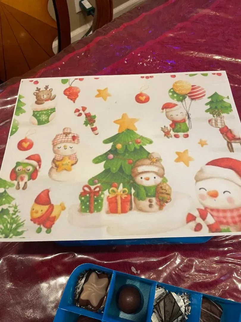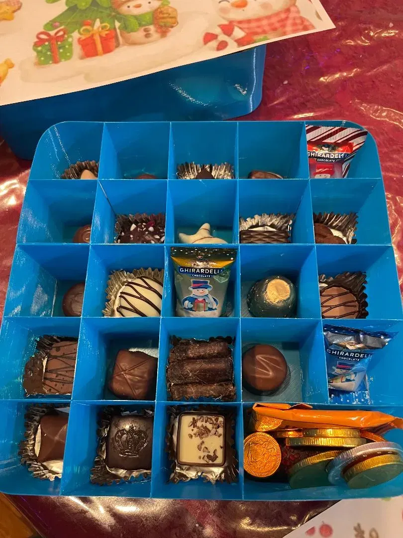 Lịch đếm ngược dùng một lần. Tường chỉ dày 1 lớp. In cả hai phần lớn và nhỏ mất khoảng 7 tiếng và dán chúng lại với nhau. Tôi dùng keo Elmers. In đẹp hơn nhiều với PETG. PLA có vẻ bị tách lớp và tường nhiều hơn. Tôi làm cái này dùng một lần để có thể gửi cho cháu tôi. Tôi bỏ đầy kẹo ngon. Phần dưới bên trái là cỡ gấp đôi để đêm Giáng Sinh chúng nhận được kẹo đặc biệt. Tôi in một bức tranh chủ đề Giáng Sinh, bôi keo Elmers dọc theo các cạnh của khe và dán cố định đường viền bên ngoài. Đặt một cuốn sách hoặc thứ gì đó phẳng lên trên để giữ bức tranh trong khi keo khô. Bạn cũng có thể dán giấy gói quà ở hai bên và mặt dưới nếu muốn. Đánh số ngẫu nhiên các khe trừ khe cỡ gấp đôi luôn là ngày 24. Tôi sẽ đăng thêm vài ảnh đẹp vào ngày mai.