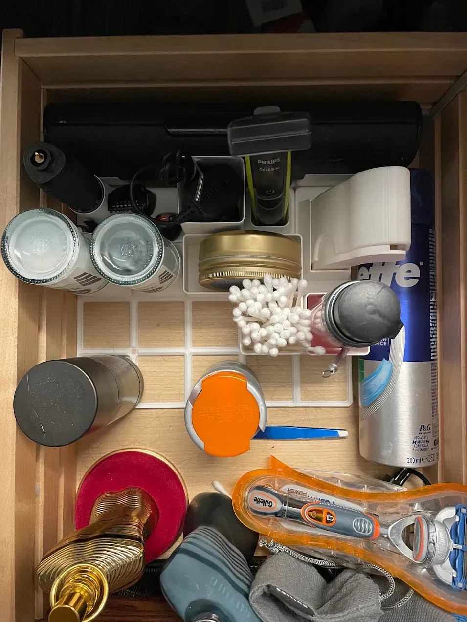 Tui đã tạo một bộ sưu tập các mẫu Gridfinity đa năng để giúp bạn sắp xếp ngăn kéo nhà tắm gọn gàng. Bao gồm đế đựng bàn chải đánh răng Oral B, hộp Plackers, tăm bông, sáp vuốt tóc, máy tỉa lông mũi, máy OneBlade và cả cây lăn khử mùi Nivea.