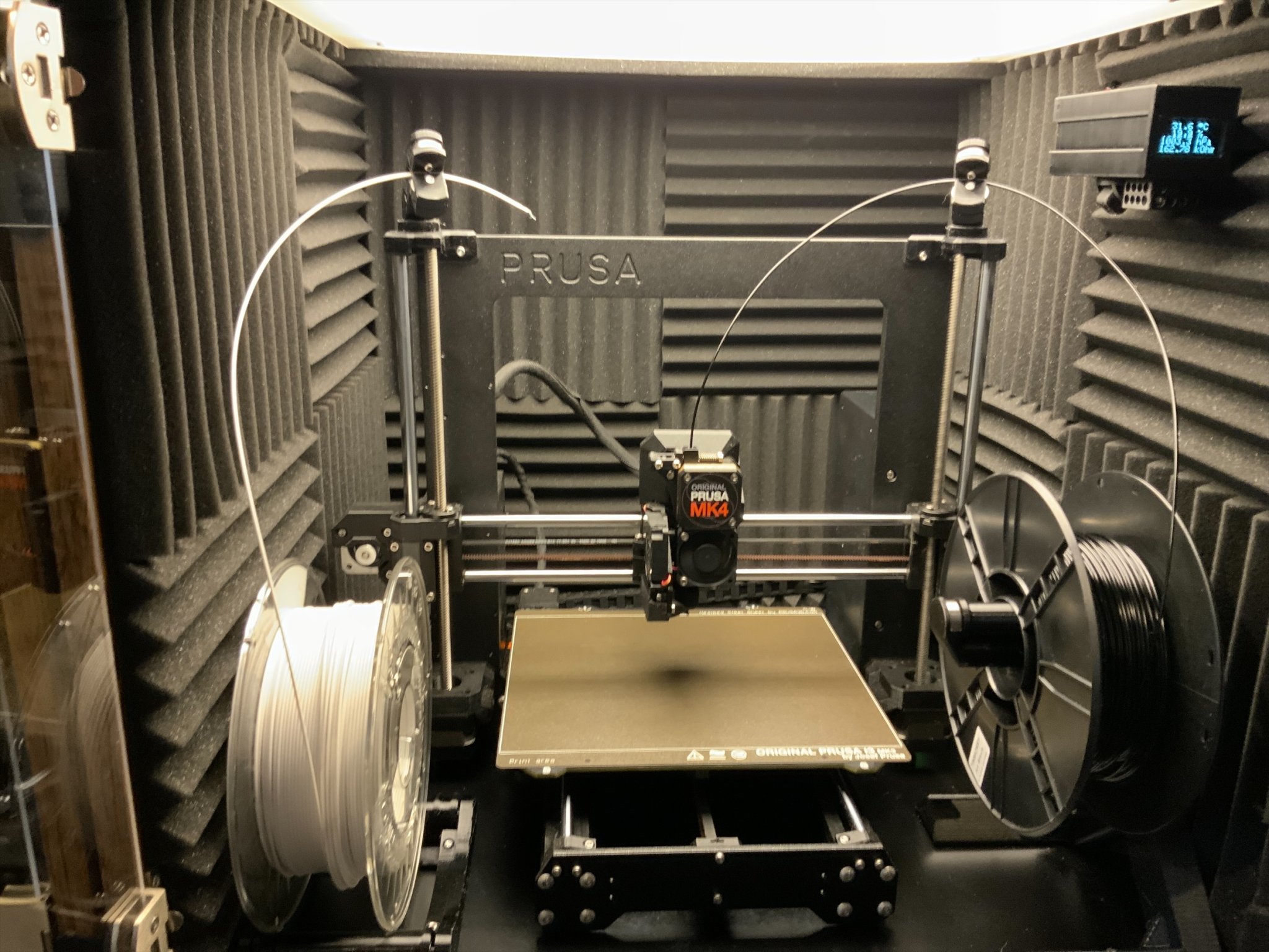 This is my version of a filament guide. Ideal if the spool is on the left or right side of the printer. It is plugged into the modified Z-top of the MK4/MK3. The angle can be infinitely adjusted by turning the holder. Very low friction from the filament. When the X-axis is moved quickly, the filament is not pushed back as much and stays well on the spool.