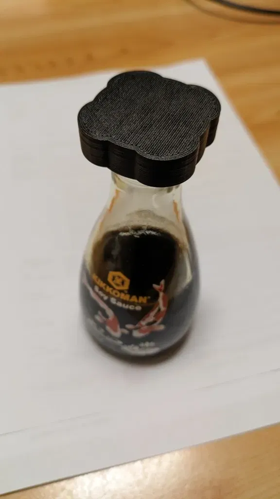 Phiên bản nắp Kikkoman thấp hơn, cầm nắm dễ hơn. Kết hợp với vòng đệm cao su 29mm, nắp đậy kín, không rò rỉ. Thích hợp cho máy in Sovol SV04, in với độ phân giải 0.2, infill 40, dùng filament PLA đen. Không cần supports, không quan trọng Rafts.