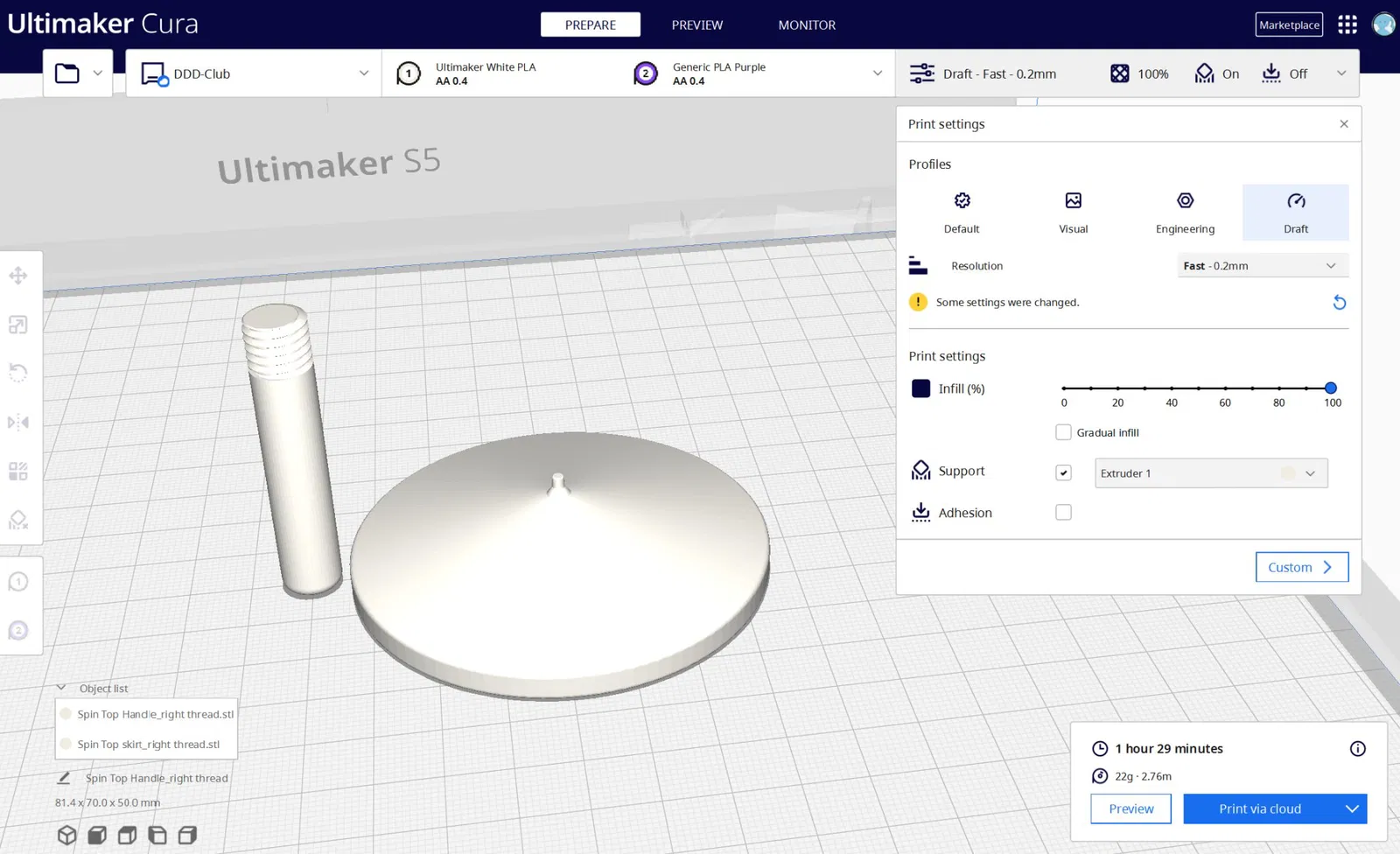Khi in tay cầm - khuyên bạn nên in với 100% độ đặc ruột, vì cái mình in với 20% độ đặc ruột - bị gãy ngay chỗ ren. In cả hai món có hỗ trợ sẽ mất khoảng 1 giờ 29 phút.
