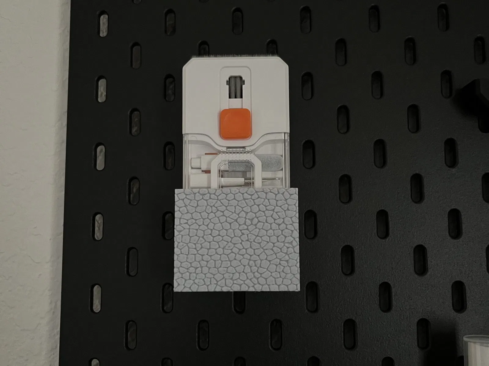 Cần tìm chỗ gắn bộ vệ sinh đồ điện tử mua trên Amazon? Tự tạo đế Skadis vừa khít, không lung lay. Tích hợp móc của Yoeri, in không cần đế. Thêm hiệu ứng đá cuội cho đẹp mắt với sợi PLA vân đá cẩm thạch.