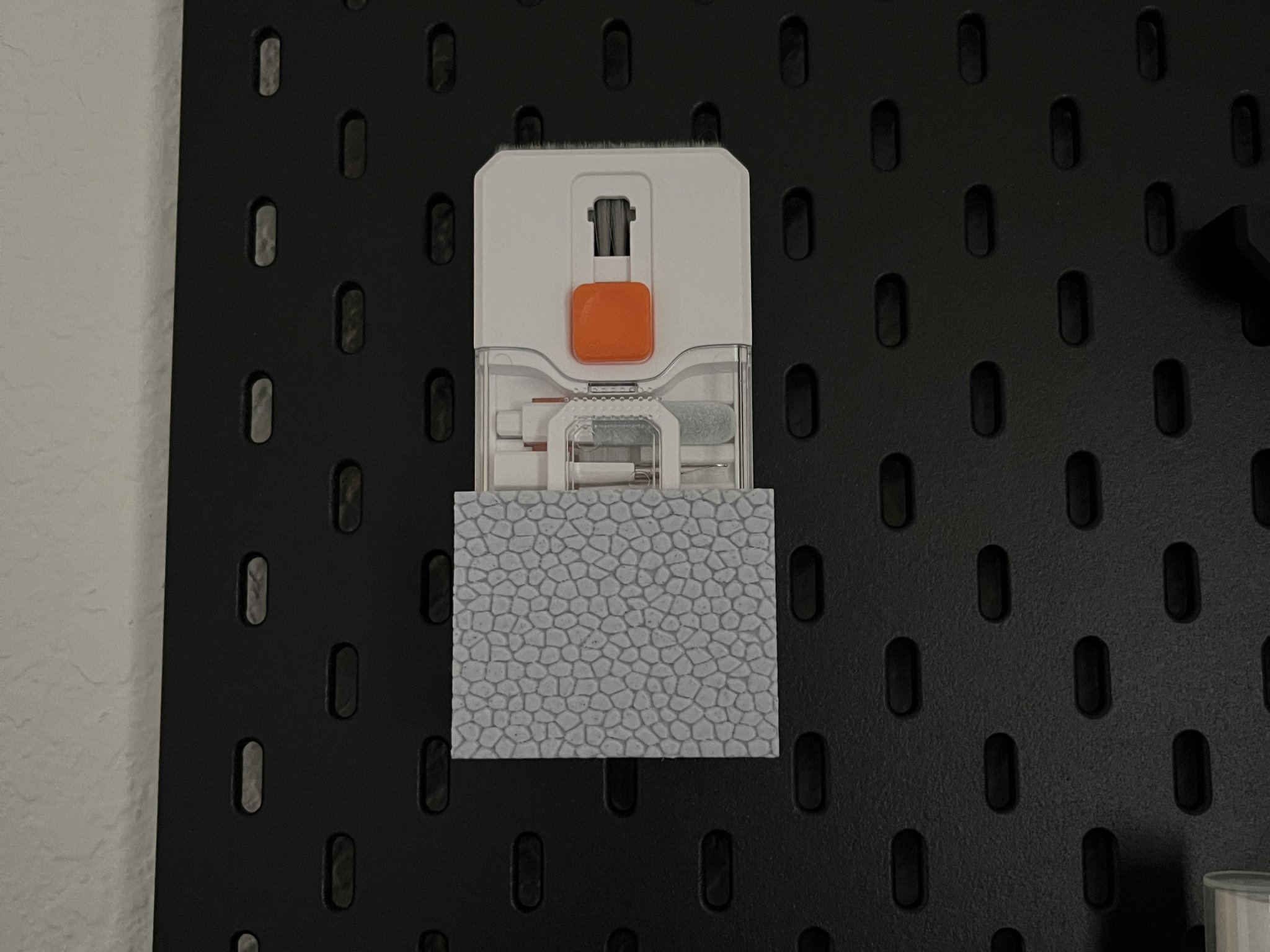 Tao cần cái đế Skadis để giữ cái bộ vệ sinh đồ điện tử của tao mua trên Amazon (https://www.amazon.com/gp/product/B0C2VBXRYG/ref=ppx_yo_dt_b_search_asin_image?ie=UTF8&th=1), nên tao quyết định tự làm một cái vừa vặn mà không bị lung lay nhiều. Tao dùng thiết kế móc của Yoeri vì nó vừa khít và cũng hoàn hảo để in mà không cần đế. Tao cũng thêm hiệu ứng đá cuội ở mặt trước vì nghĩ nó sẽ trông hay khi in bằng sợi PLA vân đá cẩm thạch này.