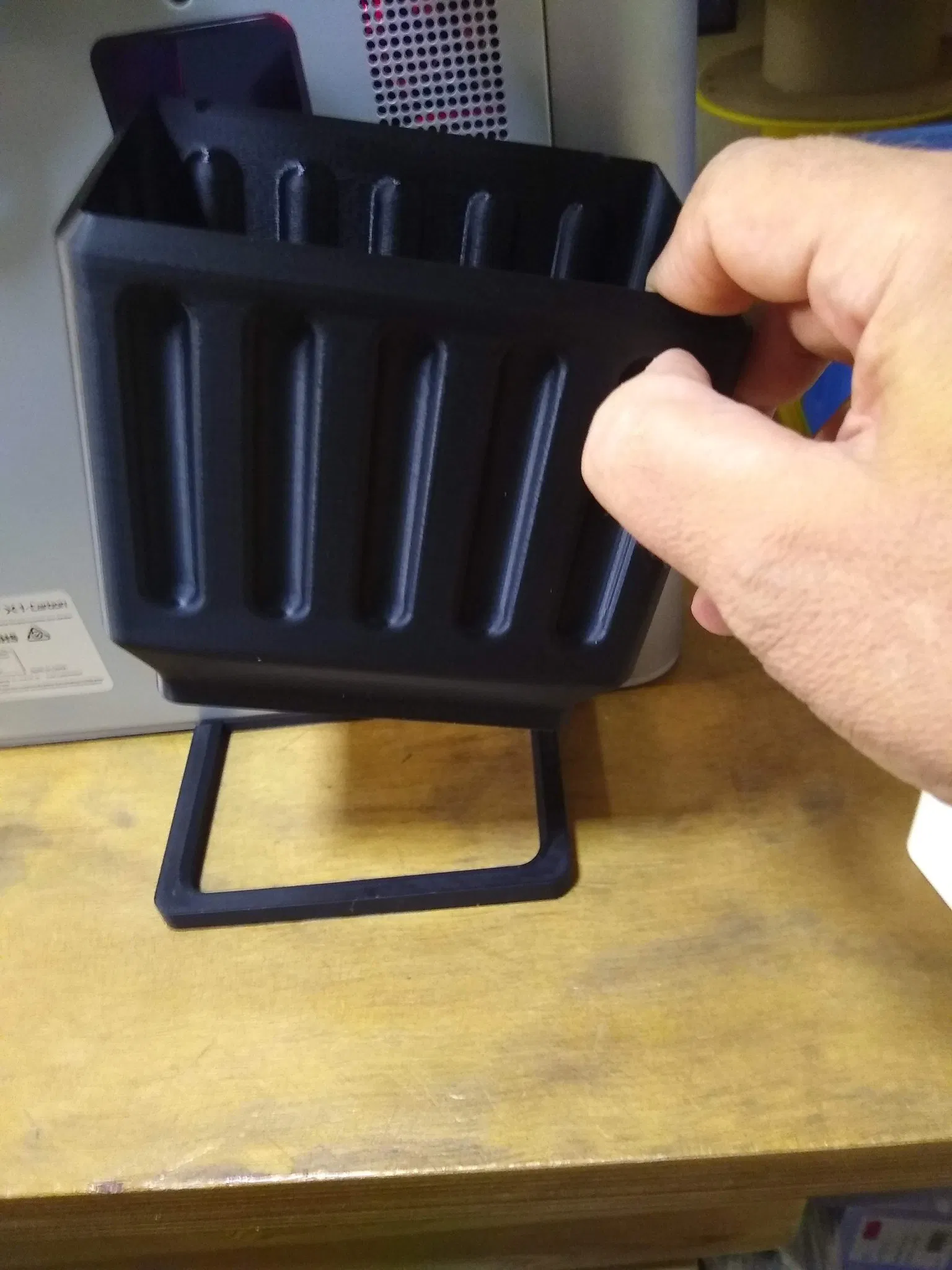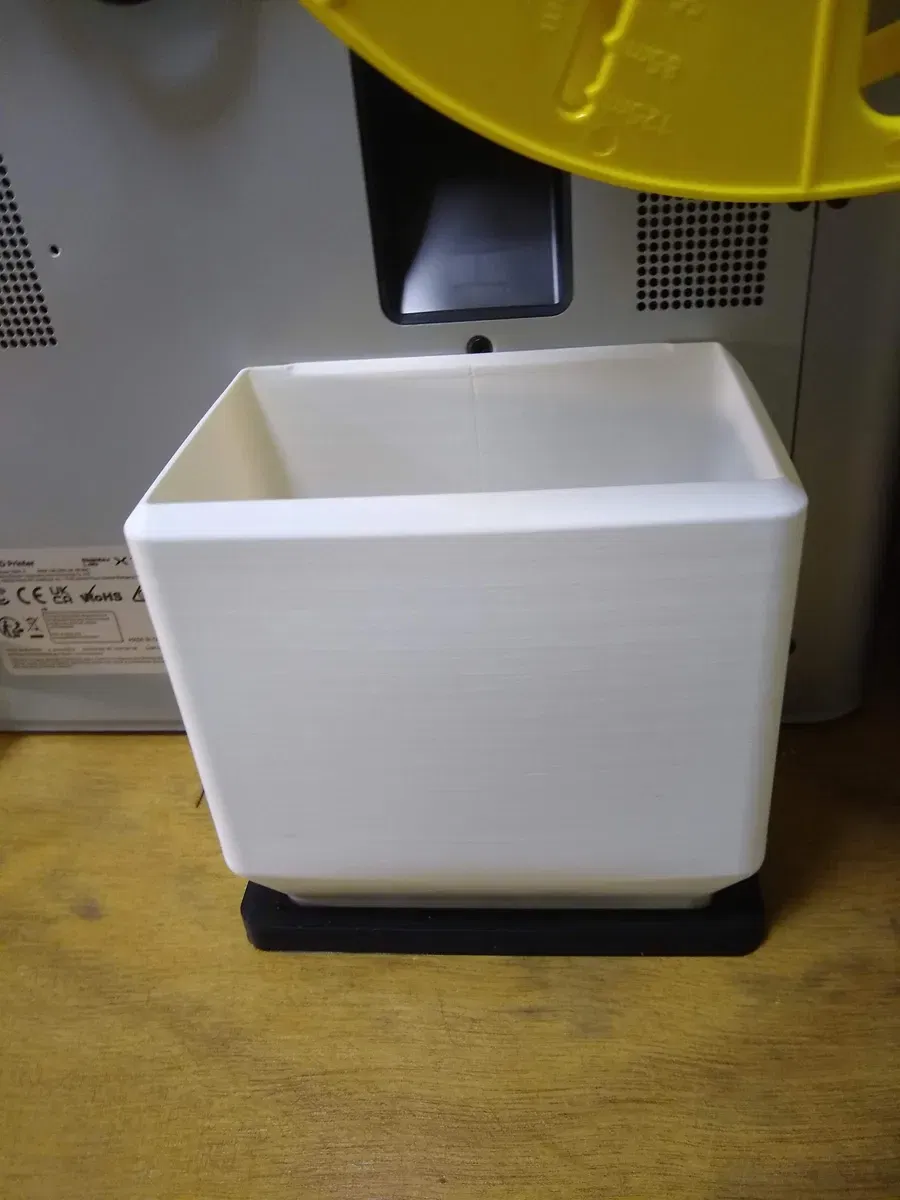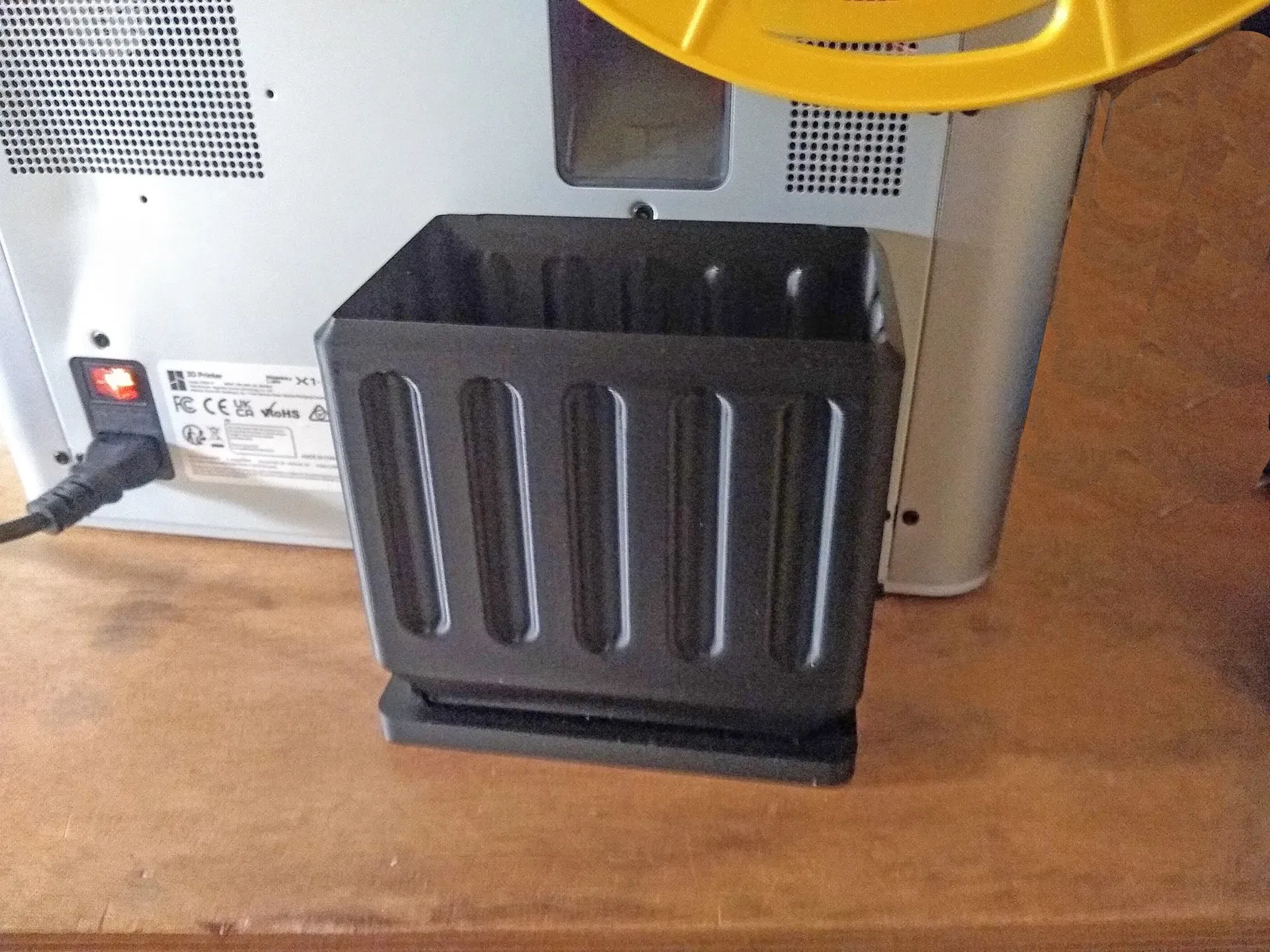 Không phải là phần hào nhoáng nhất nhưng nó rất chức năng, in nhanh (1,5 giờ), rộng rãi và dễ dàng để đặt và gỡ bỏ. Tổng độ sâu là 90 mm, tương đương với chiều dài của giá cuộn ở phía sau. Tổng thời gian in của hai phần trên X1 chỉ hơn 1,5 giờ (tốc độ tiêu chuẩn và chiều cao lớp 0,2). 1 giờ cho xô, ½ giờ cho giá đỡ. Không cần vít, không cần keo và không cần nam châm.