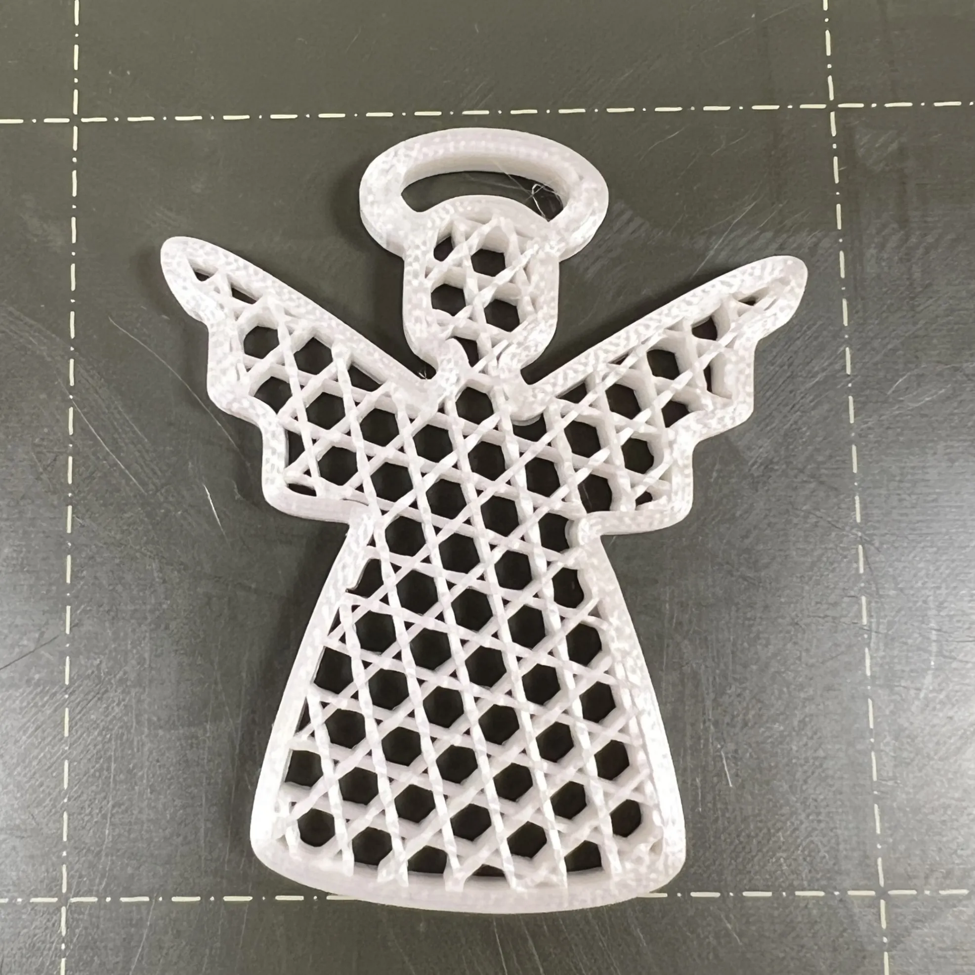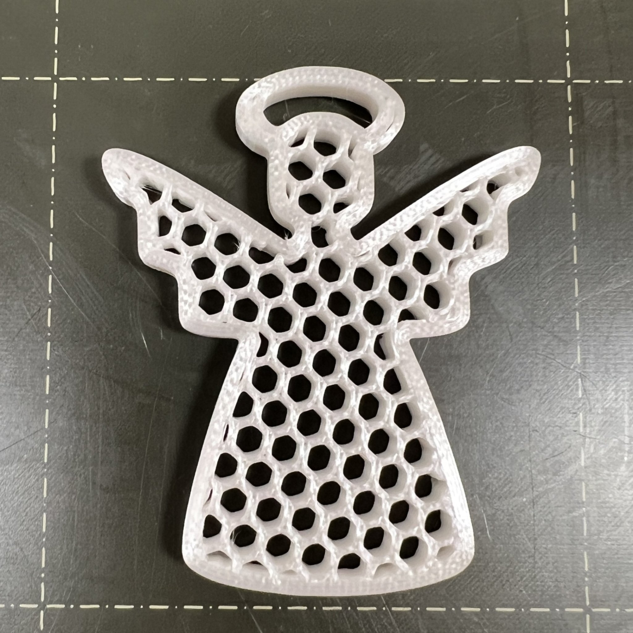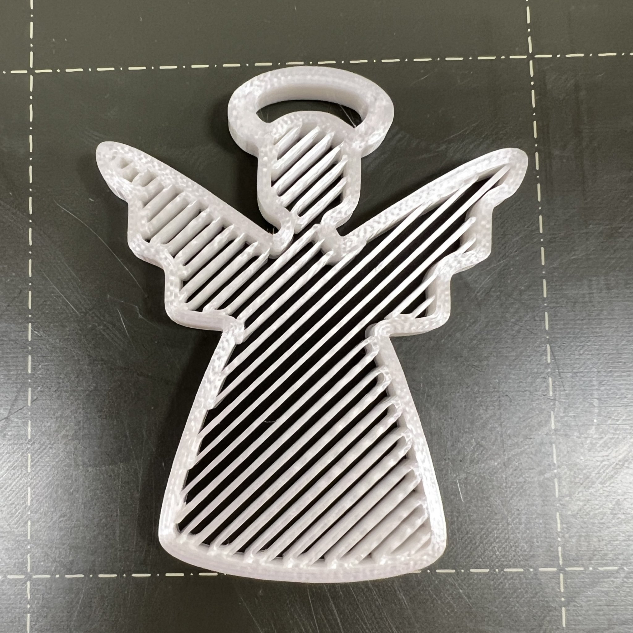 Mô hình thiên thần đơn giản để trang trí Giáng Sinh. Được in không cần lớp đáy và lớp trên, sử dụng các loại infill khác nhau. Kích thước 47.92 x 40.35 x 4 mm, thích hợp dùng PLA với lớp in 0.2 mm. Có lỗ trên quầng sáng để treo.
