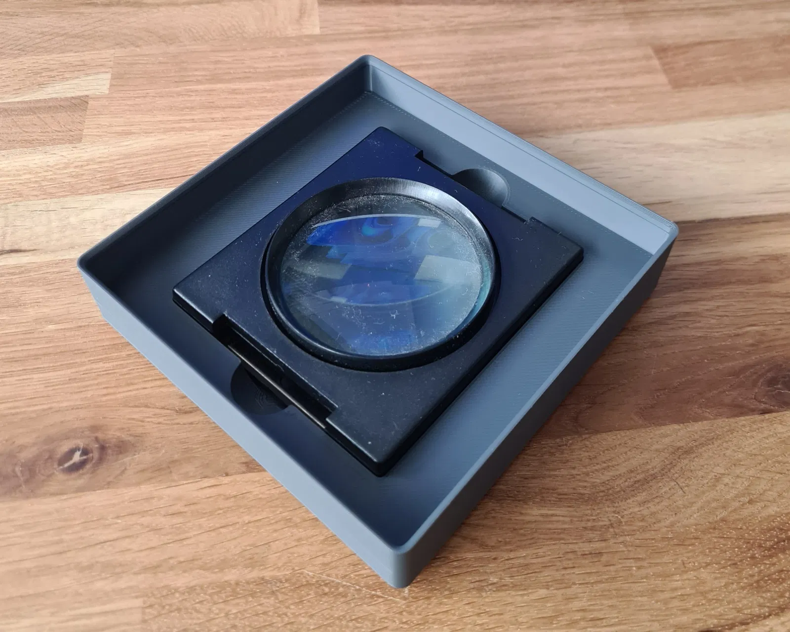 Đây là một khay lưu trữ Gridfinity dành cho một loại kính lúp đặc biệt có kích thước 95 x 85 mm. Có thể xếp chồng lên nhau.