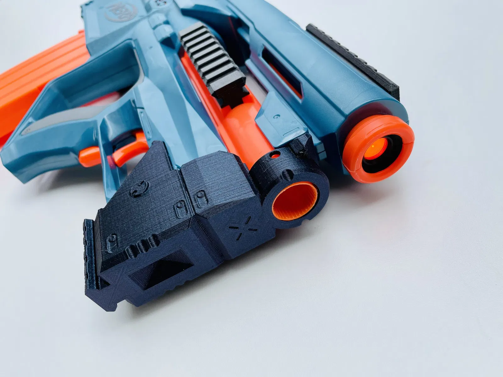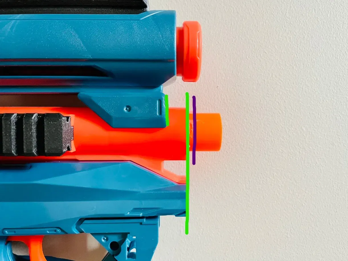Đây là một vòng nòng cơ bản và nắp trước để thay thế khu vực nơi bơm bắn trắng từng nằm trên Motoblitz. Nó giảm chiều dài nòng một vài inch và tăng hiệu suất cũng như tính dễ xử lý. Biến Motoblitz thành một khẩu súng bullpup. Nó đẹp ở bên ngoài và xấu ở bên trong của vật thể nắp do cố gắng điều chỉnh và phù hợp với hình dạng kỳ lạ của một Motoblitz đã được cắt ngắn. Sử dụng một ít keo nóng hoặc E6000 để dán nó vào vị trí. Ép chặt và giữ cho đến khi nó cứng lại. Bạn không cần một lượng lớn keo. Một ít xung quanh cổ nòng, các tấm bên hình tam giác và đầu rất trước nơi nó sẽ ép vào vỏ thân. Thực hiện tất cả điều này với nòng bên trong ra khỏi bắn. Chèn nòng bên trong cuối cùng. Điều này sẽ cho phép bạn xác định bạn muốn cắt bao nhiêu. Đảm bảo rằng nòng đã được ngồi hoàn toàn vào lồng của bạn. Nếu bạn muốn, bạn có thể để một chút nòng thừa cho mục đích thẩm mỹ, bạn có thể cắt ngắn miệng nòng gốc và dán nó vào phía trước. Bạn có thể để nòng không cắt, chỉ cần nhớ rằng nòng ngắn hơn sẽ mang lại hiệu suất tốt hơn. Các thanh ray được remix từ những nguồn này. Cảm ơn các tác giả tương ứng. Tôi đã in chúng nằm ngang với các giá đỡ để tối đa hóa độ bền, đặc biệt là của các tab và lỗ vít. Tất cả đã được thay đổi thành hình học Lynx tiêu chuẩn mà tôi đã sử dụng và biết là hoạt động. Đã chỉnh sửa một số lỗ vít để tăng cường độ bền. Lồng mà tôi đã sử dụng trong bản xây dựng cá nhân của mình đến từ BuffDaddyNerf nổi tiếng