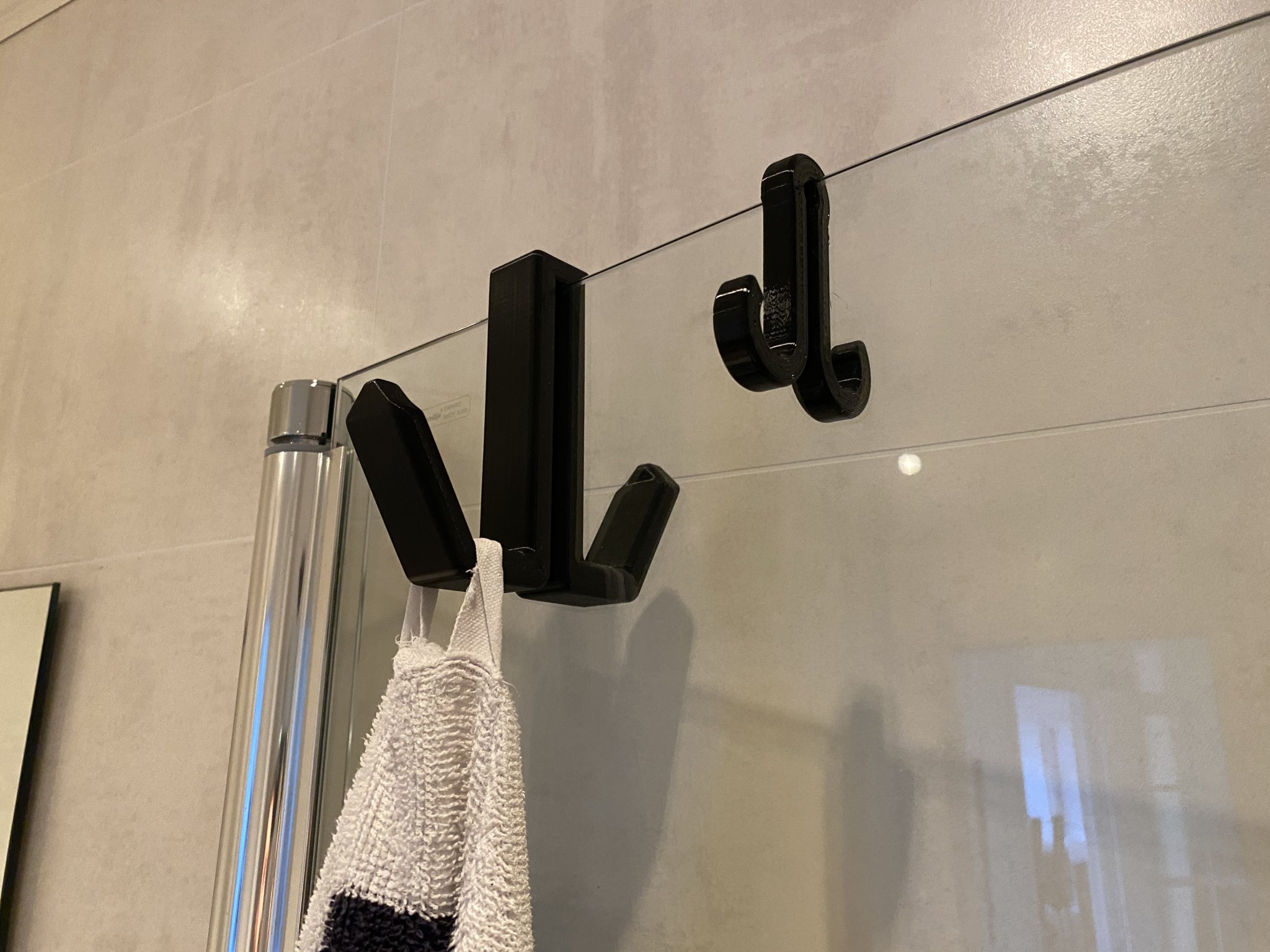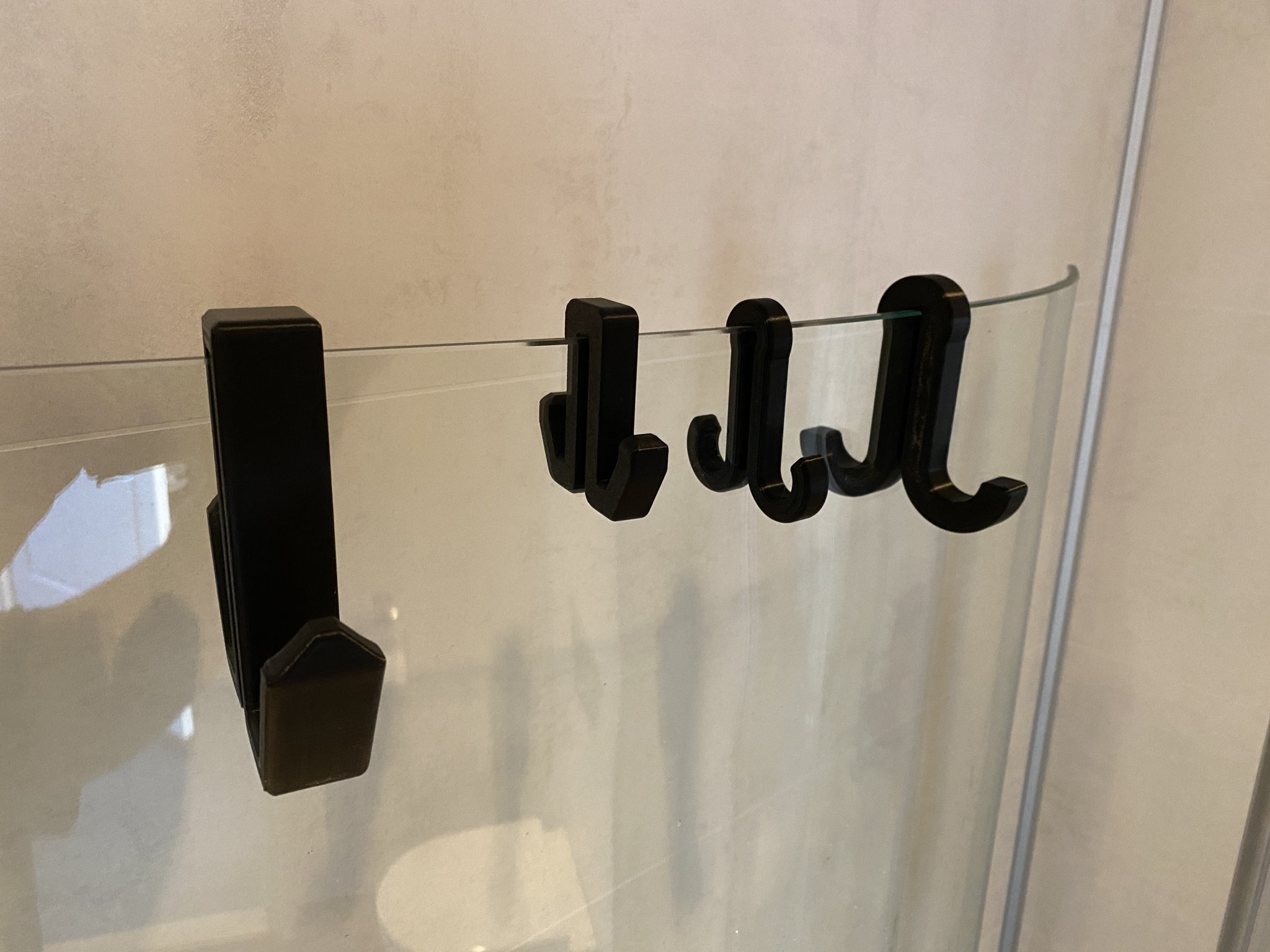 Móc treo khăn đơn giản cho cửa hoặc tường phòng tắm. Có thể treo khăn ở cả bên trong và bên ngoài. Đã có 4 phiên bản với các kích cỡ và độ chắc chắn khác nhau, dễ dàng tùy chỉnh kích thước theo độ dày cửa kính.