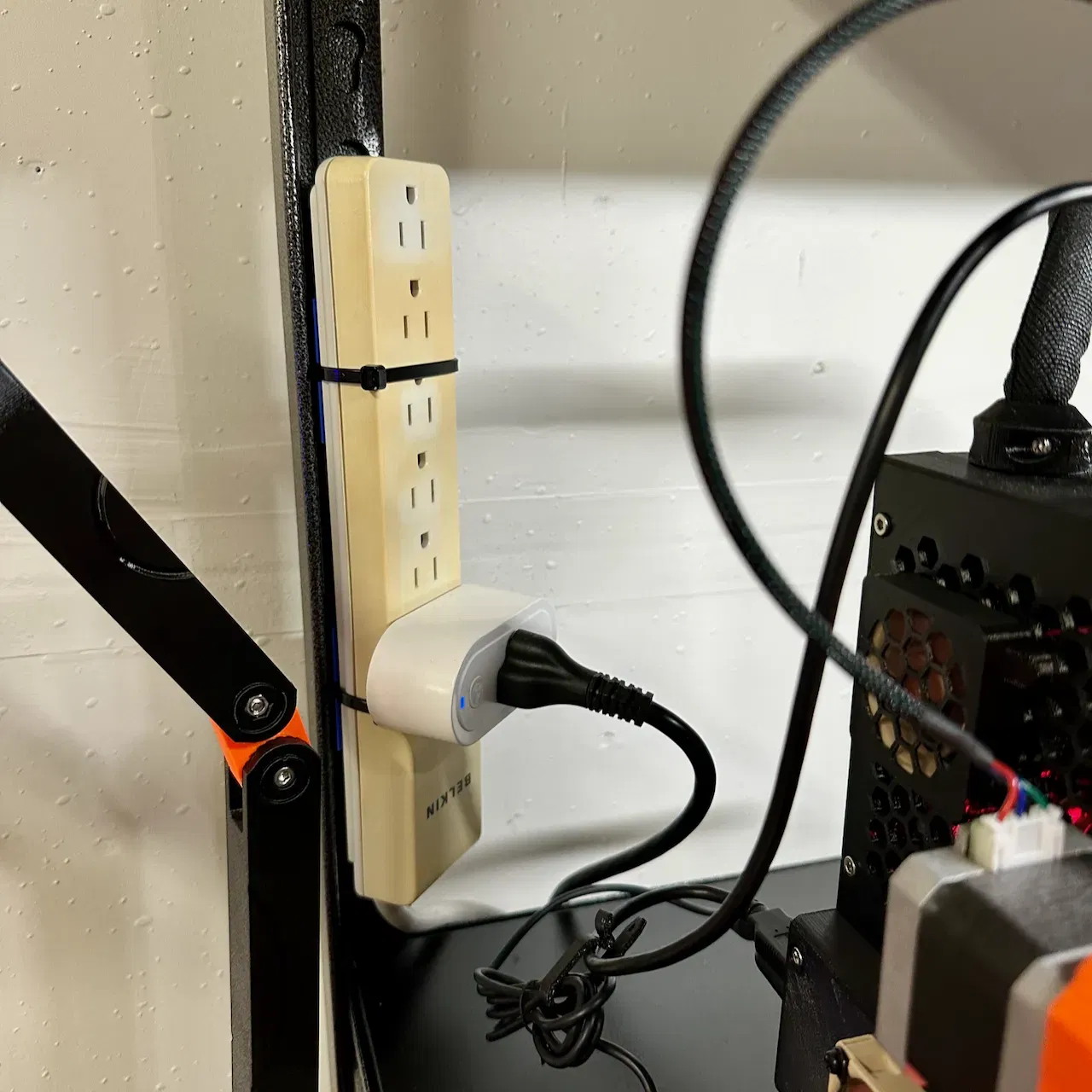 Tôi làm cái này với ý tưởng là có một ổ cắm điện nhỏ gọn đặt kế bên mỗi máy in để tiện cắm máy in cũng như các phụ kiện khác. Ngoài ra, bạn có thể dùng băng keo VHB hoặc loại keo dán khác để gắn camera theo dõi quá trình in.