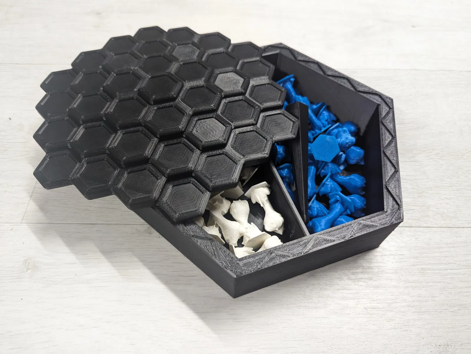 Hộp đựng game Prusa Balance đơn giản với chân đế tích hợp, sử dụng mặt bàn cờ làm nắp đậy. Có đủ không gian để lấy quân cờ ra chơi trực tiếp. Có phiên bản tùy chọn không vách ngăn.