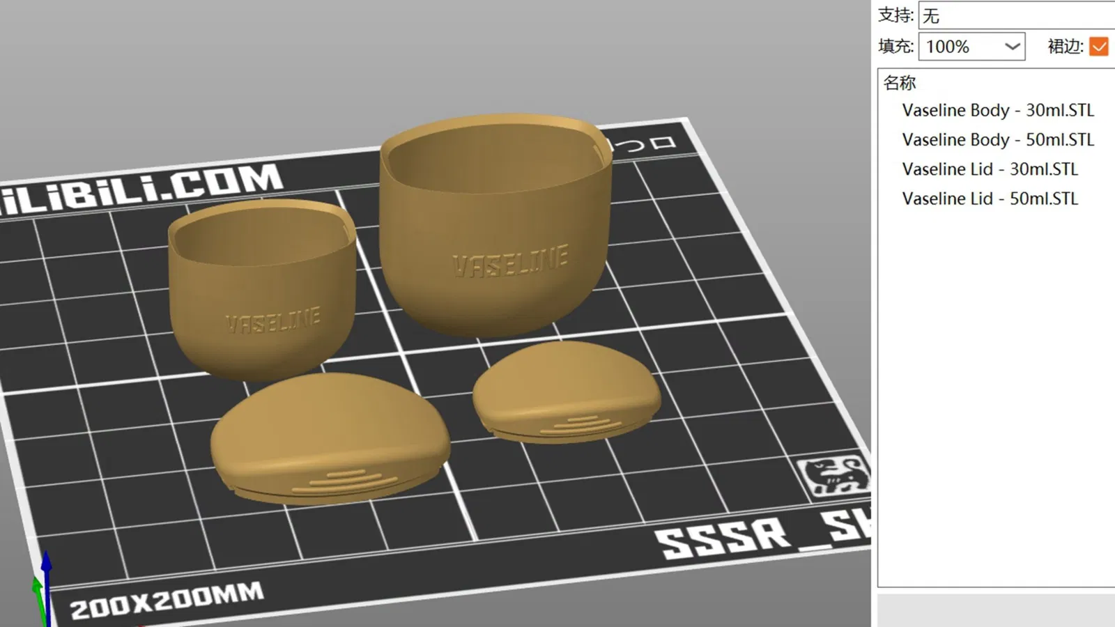 Khuyến khích sử dụng vật liệu PETG, với phần Thân (Body) in 100%. Phần Nắp (Lid) cần có vành (brim). Không cần vật liệu hỗ trợ (support).