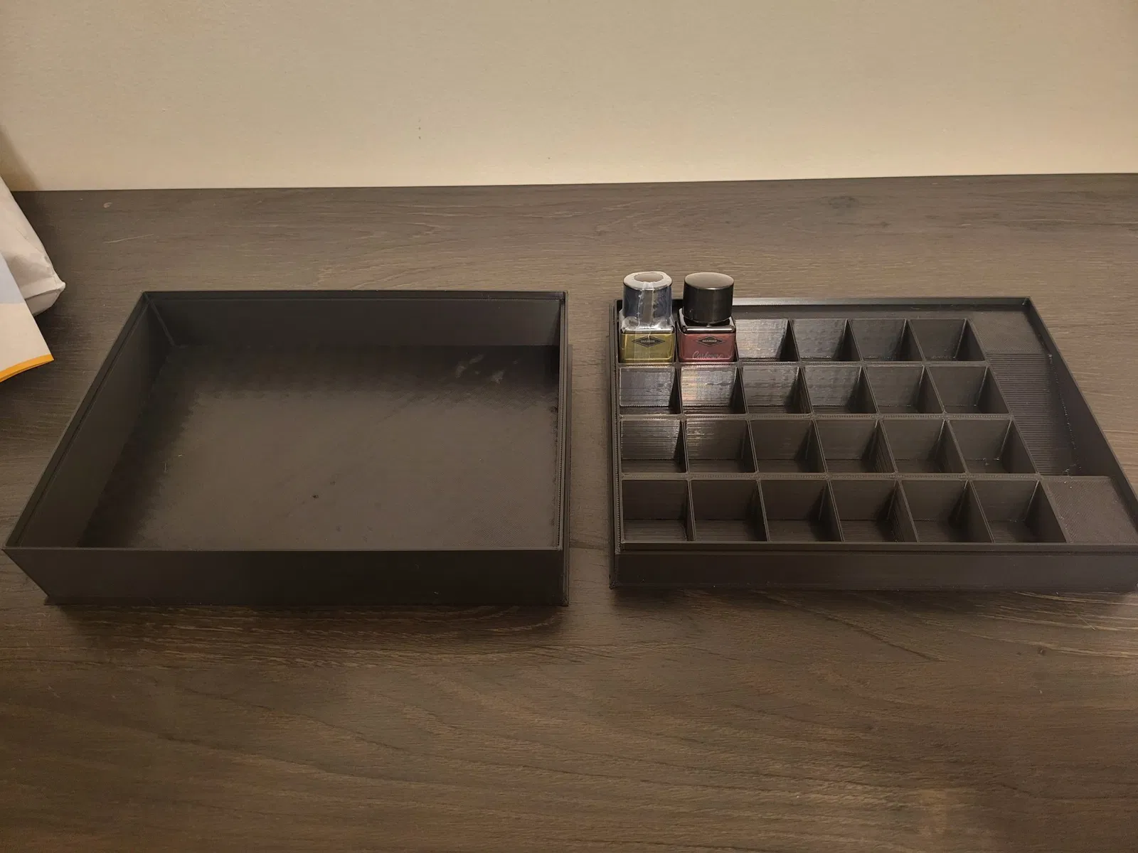 Năm nay tui có mua cho ba dượng cái Lịch Diamine Advent Calendar hồi Giáng Sinh, mà ổng không có chỗ để mấy chai mực nhỏ xíu đi kèm, nên tui mới tạo cái hộp này cho ổng. Cái hộp có các khe để vừa hết 24 chai nhỏ, với 1 chỗ cho chai lớn 30ml.